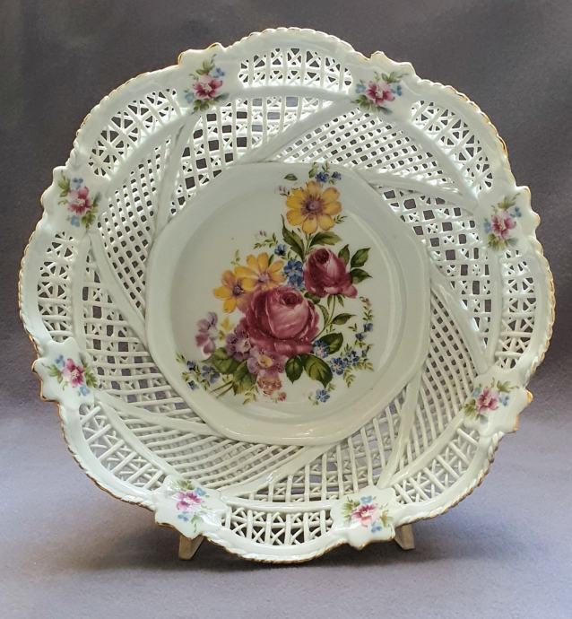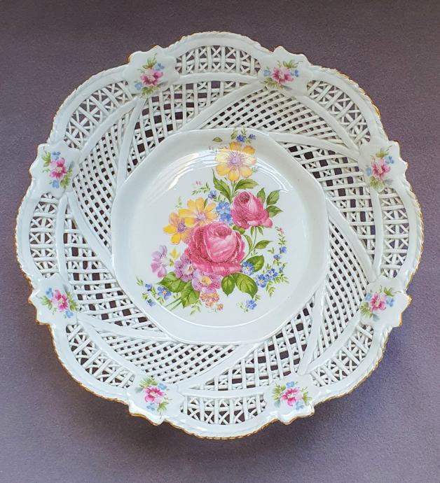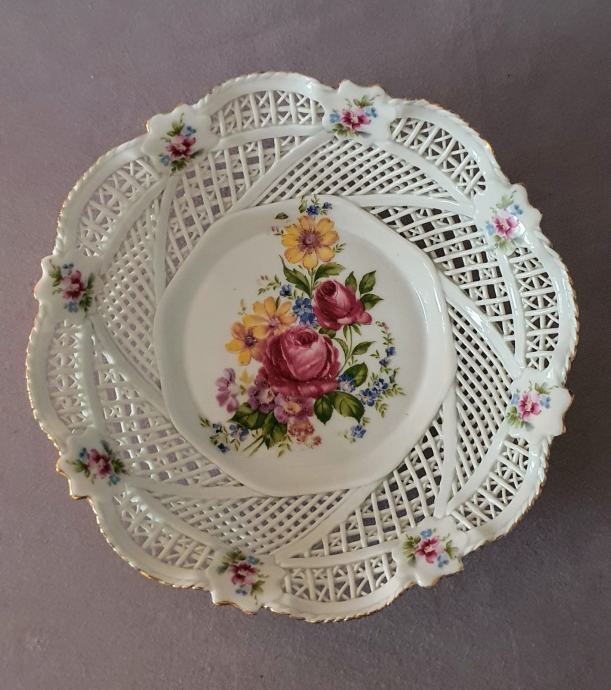 Promjer 31 ,visina 6 cm rubno cijela u rupičastom extra tankom porculanu stanje savrseno motiv cvijetni pozlata