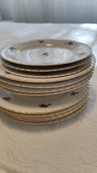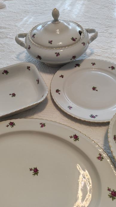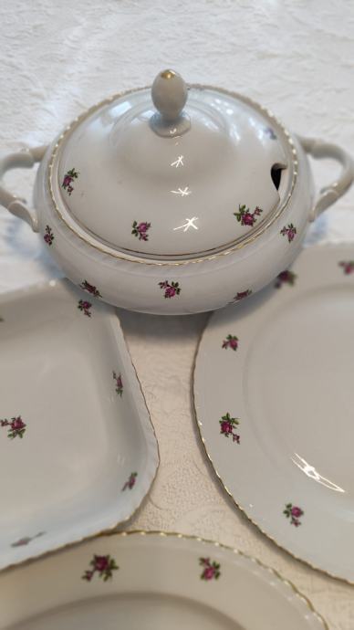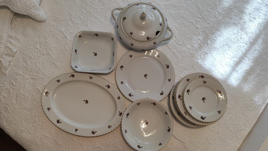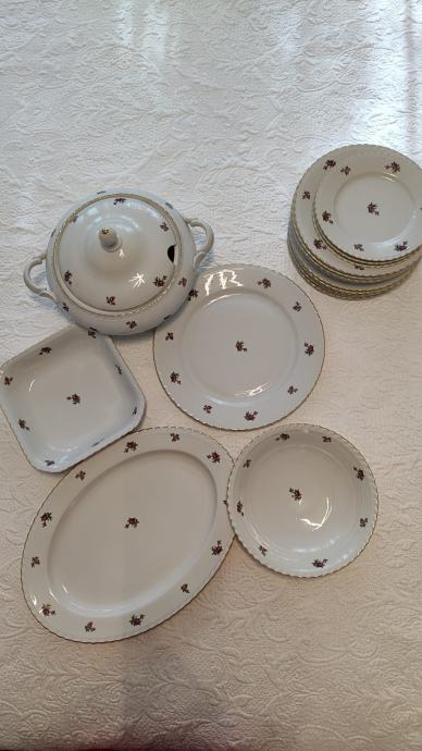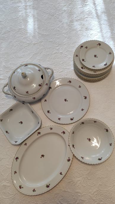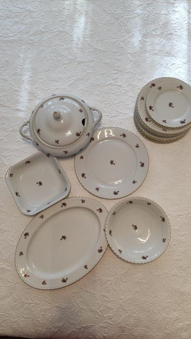 set se sastoji od zdjele za posluživanje juhe, dvije zdijele, pladnja, većeg okruglog tanjura, 5 plitkih tanjura, 4 duboka tanjura i tri mala tanjura