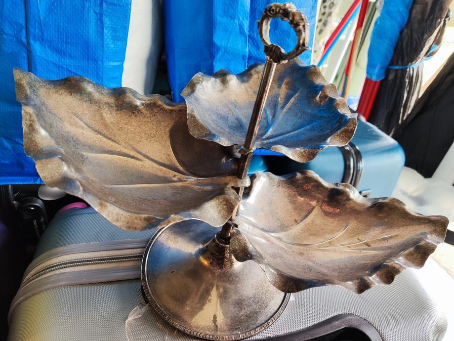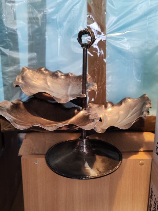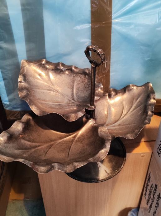 Prodajem posrebreni pladanj u obliku listova, atraktivnog dizajna s dva nivoa. Pladanj ima elegantnu konstrukciju s centralnom ručkom u obliku prstena, što omogućuje lako nošenje i serviranje. Svaki nivo je oblikovan kao list s detaljno izrađenim rubovima i žilama, što mu daje prirodan i dekorativan izgled. Posuda kombinira posrebrenu završnu obradu na listovima s tamnom bazom. Funkcionalan je za serviranje čokolatina, kolača, voća, sitnih zalogaja ili kao dekorativni element na stolu.