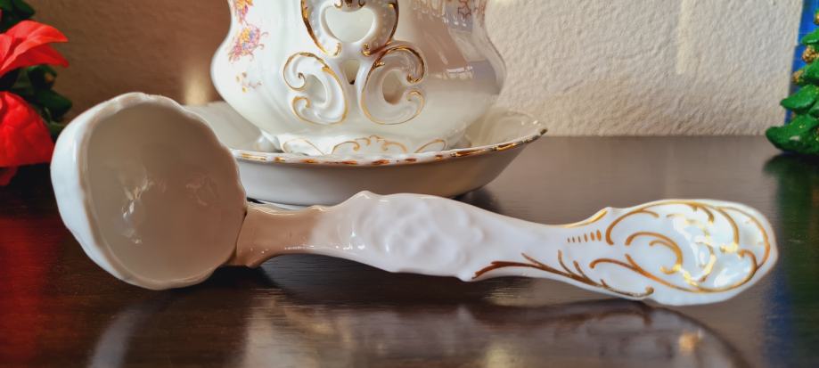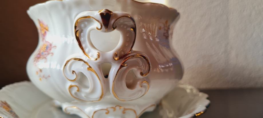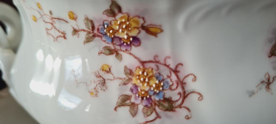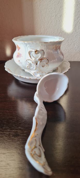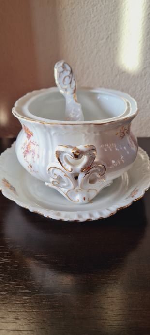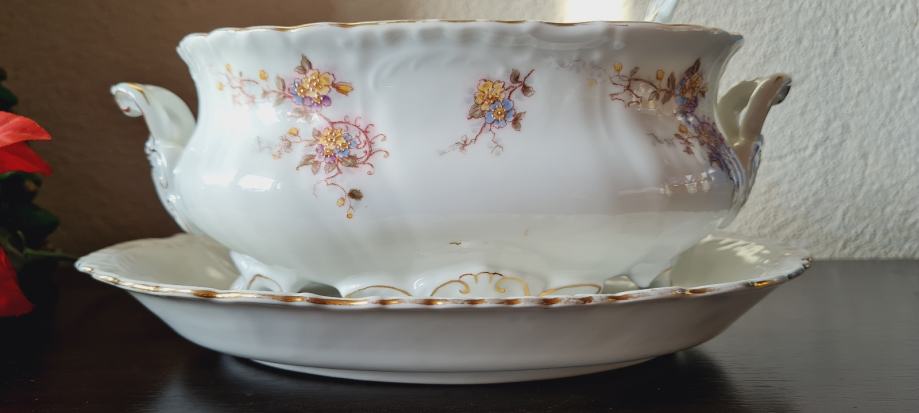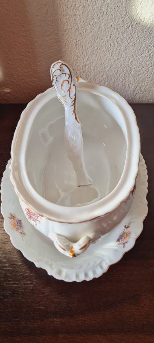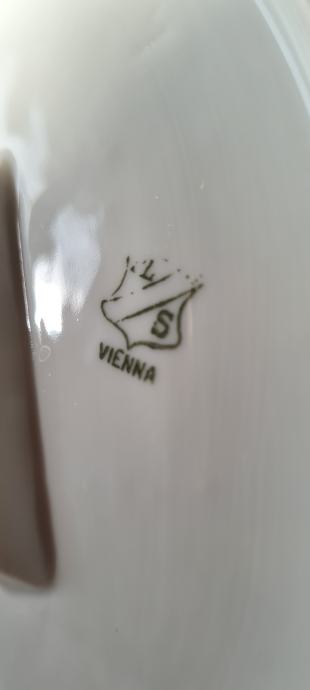 Posuda za umak, ili slično. Kraj 19- og ili početak 20- og stoljeća. Ova rijetka i fascinantno lijepa zdjela ručno je oslikana. Spojena je sa tanjurom, a sa strane ima i pripadajuća žlica ili kaciola, kako god. Rađena u periodu od 1884 do 1914- e godine, kad je tvornica zatvorena. PLS VIENNA.