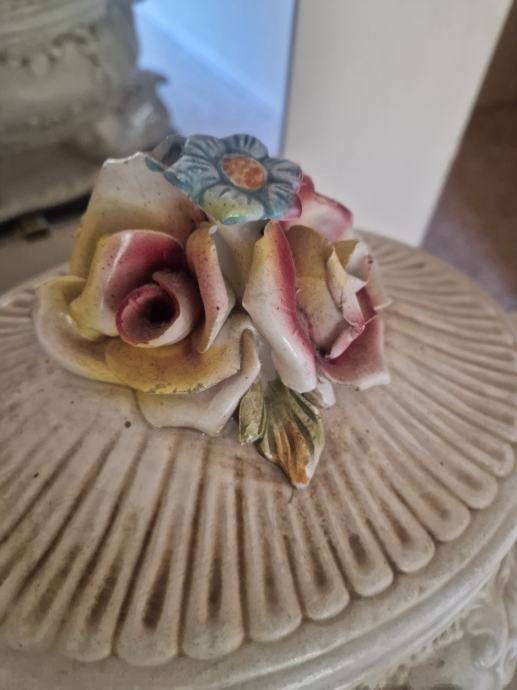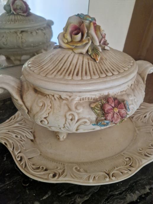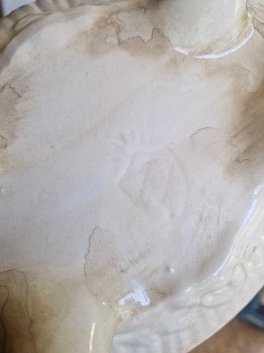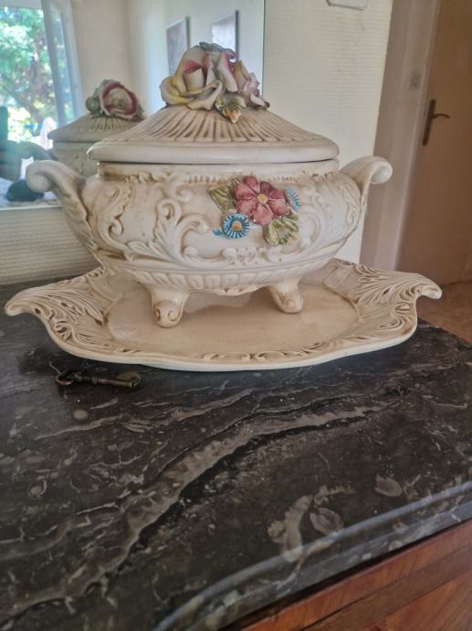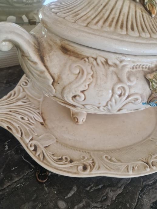Baš je lijepa, dekorativna i velika :) dimenzije pladnja su oko 40 cm, dužina zdjele oko 26 cm a ukupna visina negdje oko 23 cm....vintage rad, skroz solidno stanje s obzirom na starost ( mrvica latice, baš se i ne vidi) . Poruke na whatsapp