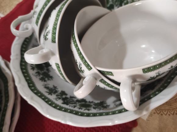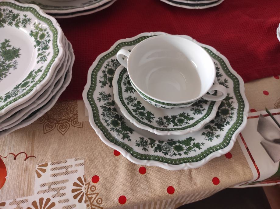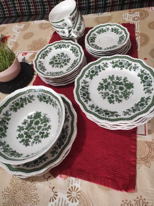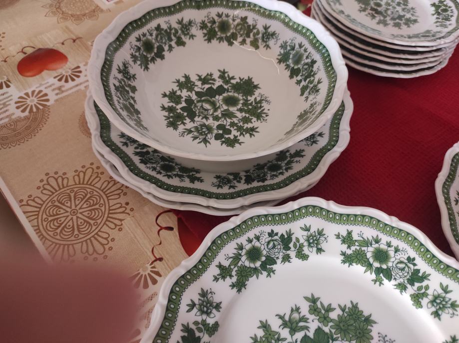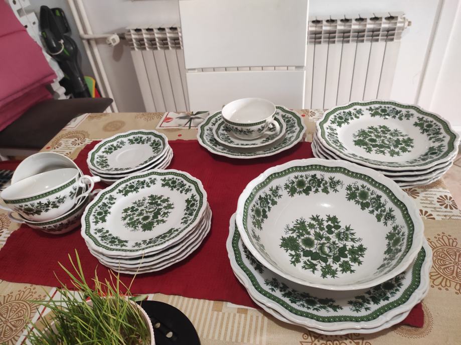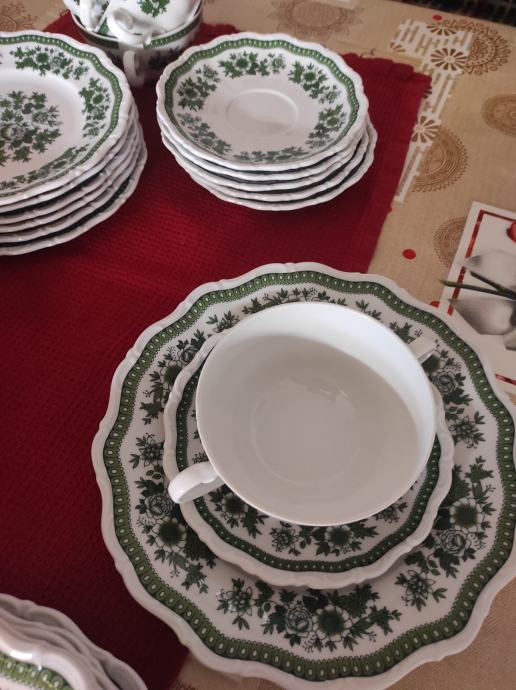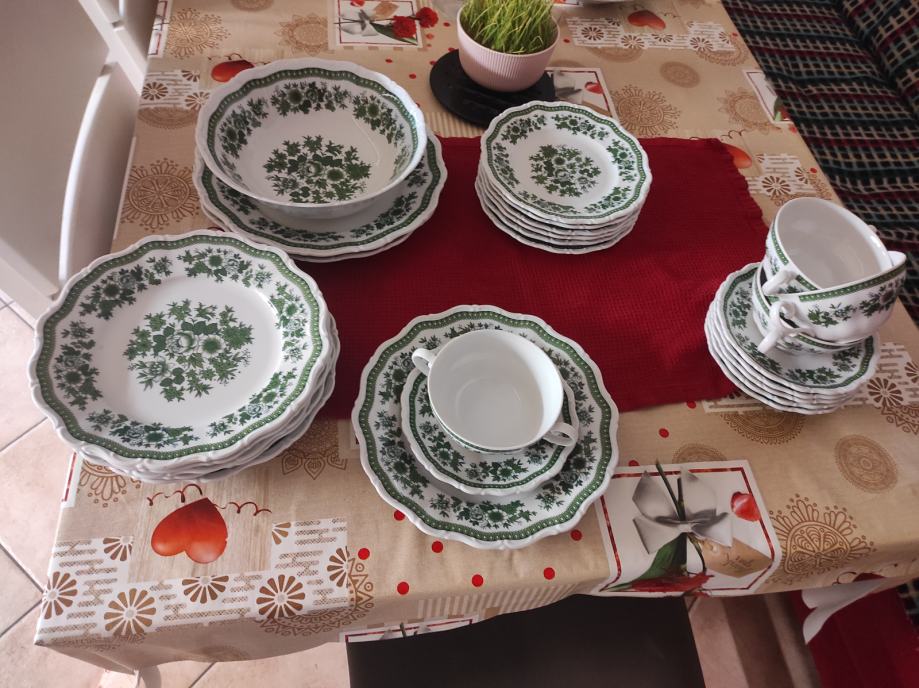 jedinstvene ljepote servis za jelo.6 plitkih tanjra za jelo.6 zdjelica za juhu i pripadajućih tanjurića za ispod.6 manjih tanjura za desert ili predjelo.manli tanjurići mogu biti za salatu.2 veća tanjura za serviranje. zdjela za salatu.Sve izgleda kao da je sada proizvedeno kako izgledaju stvari rađene u njemačkoj.kvalitetno i lijepo.zdjelice imaju dvije ručke i zapremina juhe je kao u tanjuru.Servis se može prati u suđe mašini bez ikakvih posljedica.Servis izgleda kao da u opće nije korišten.,a korišten je par puta za blagdan.lokacija je sl.brod.kontakt na 0958710778