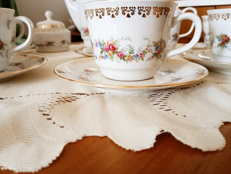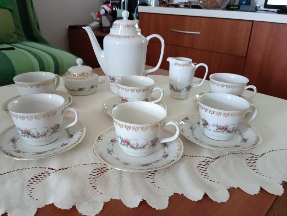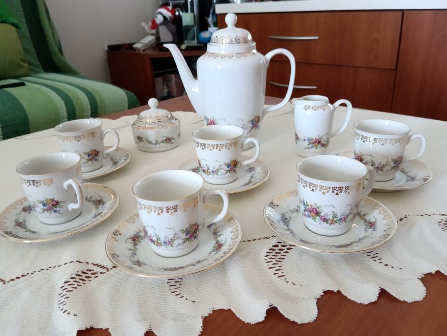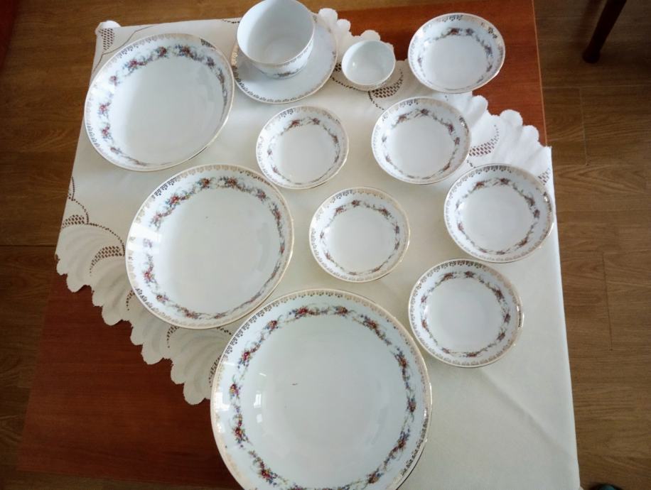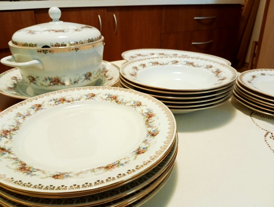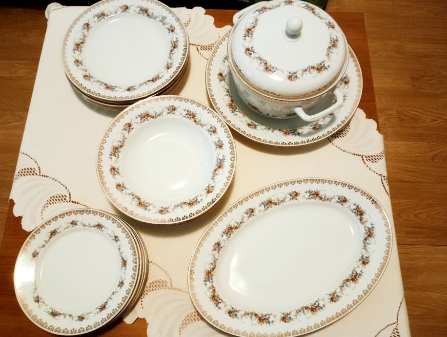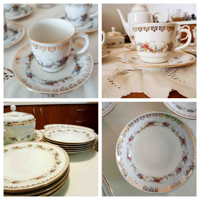 Servis za ručavanje (64 komada) nikad korišten. Sastoji se od jušnika, 6 dubokih tanjura, 6 plitkih tanjura, 6 desertnih tanjura, velikog ovalnog tanjura i velikog okruglog tanjura. Komplet servis za čaj, servis za crnu kavu (malu). Tri zdjele za salatu, šest zdjelica za kompot.