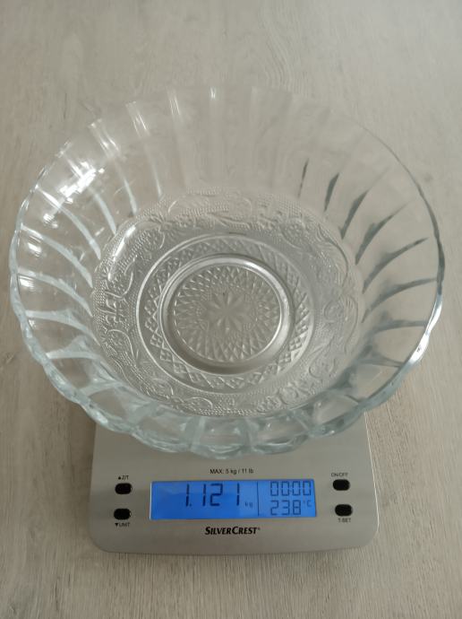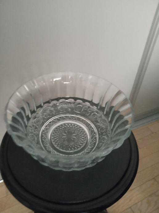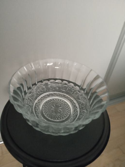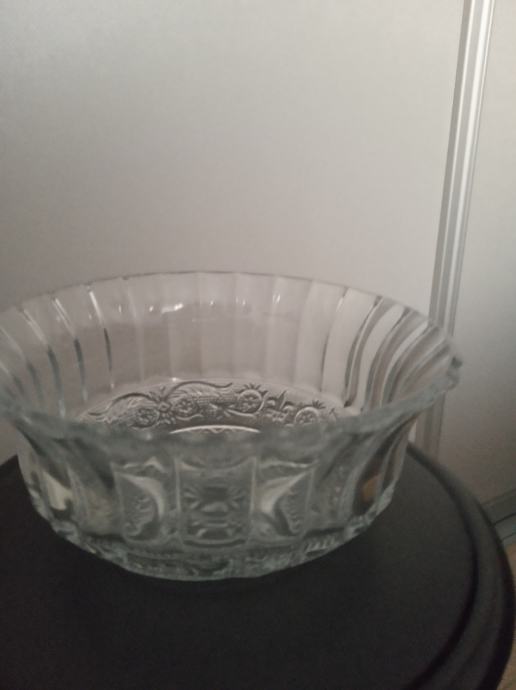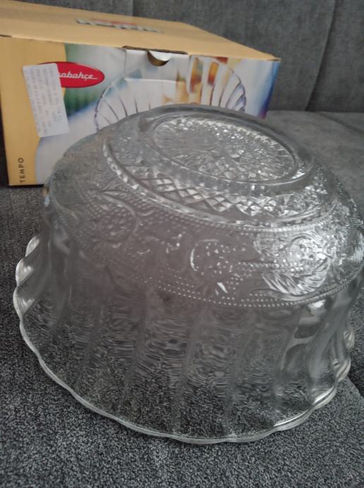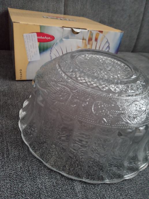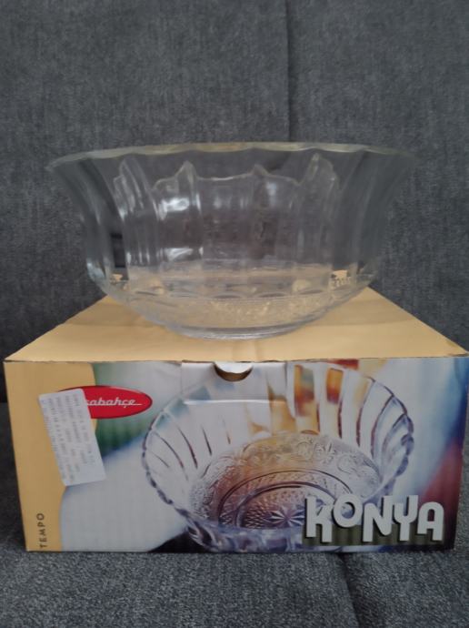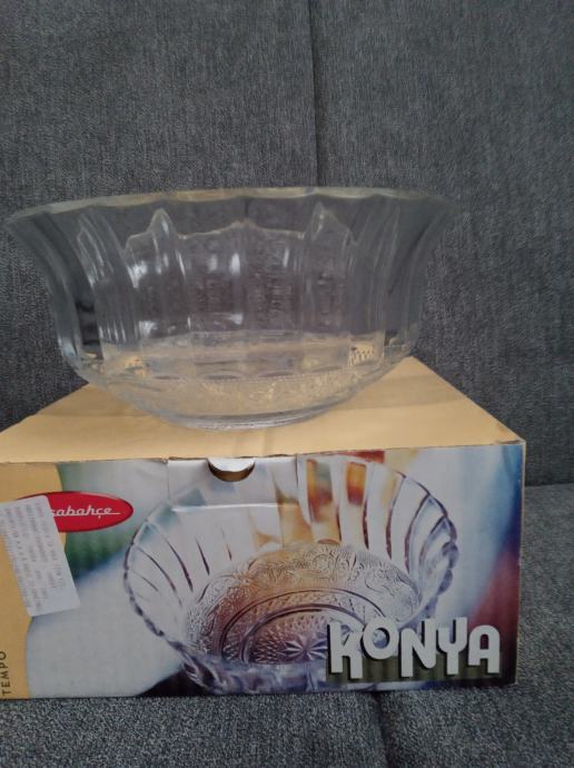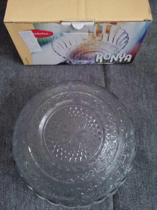 Staklena ukrasna zdjela Konya,bogato reljefno ukrašena od kvalitetnog turskog stakla proizvođača Pasabahce, promjera 21,5cm,visine 10cm, težine 1122g,novo u original kutiji,prikladno za poklon