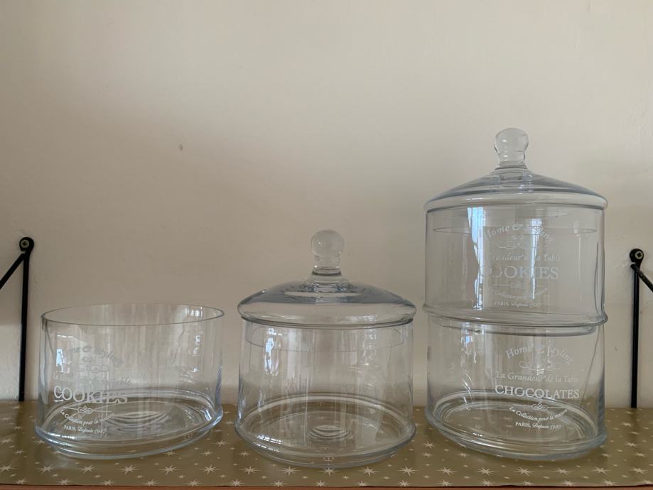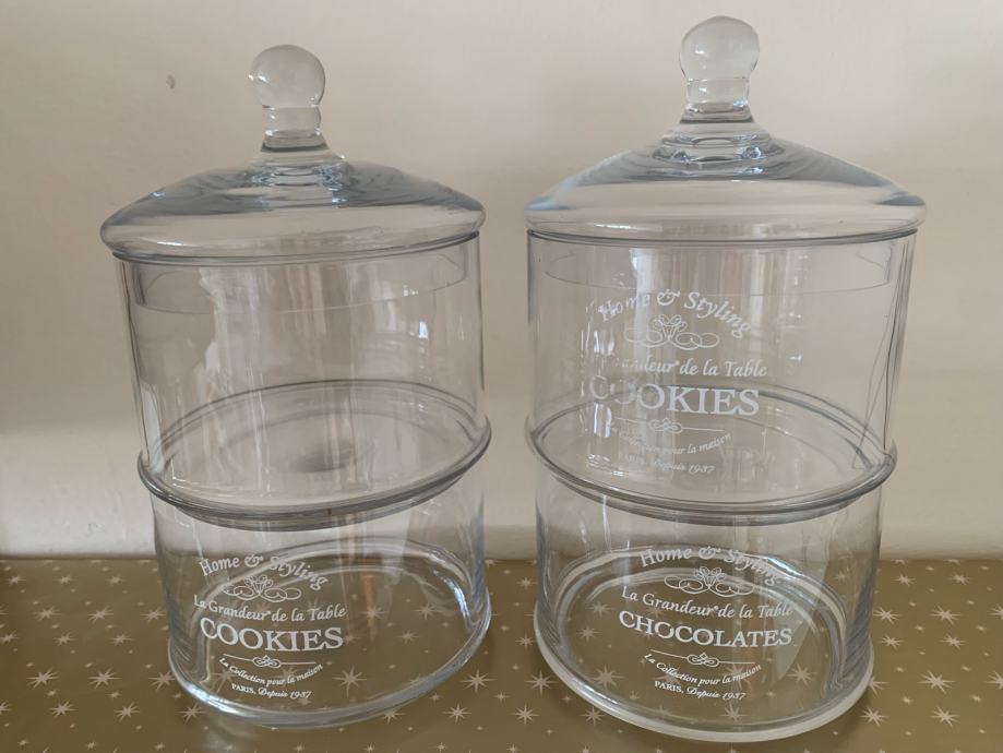Prodajem dvije lijepe dvostruke staklenke za kekse. Dimenzije: 28 cm ukupna visina dvije, promjer 16 cm. Neoštećeno, cijena za sve 15 eura, za jednu 10 eura. Preuzimanje osobno.