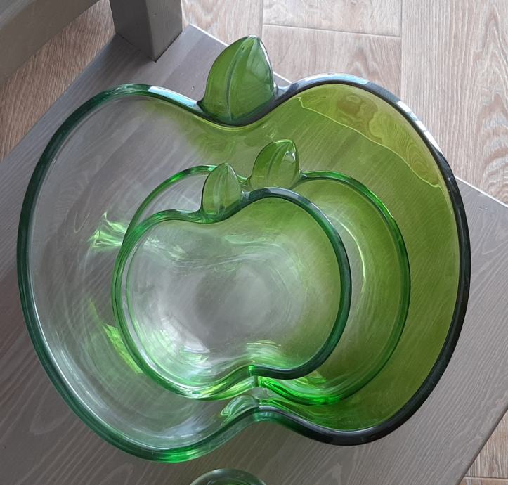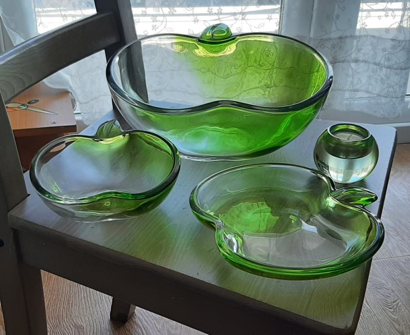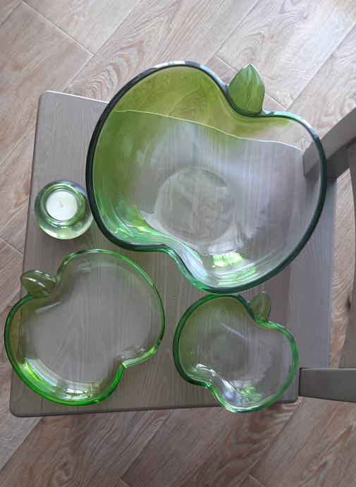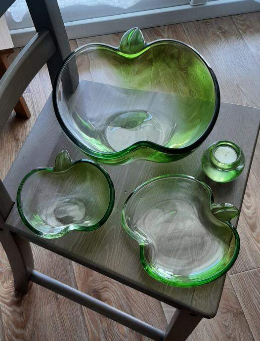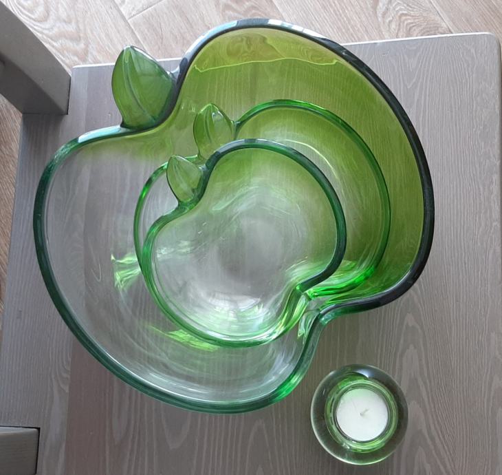 3 staklene zdjele u obliku jabuke sa staklenim zelenim svjećnjakom.
