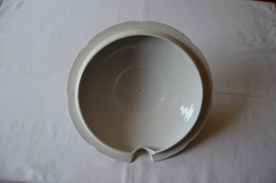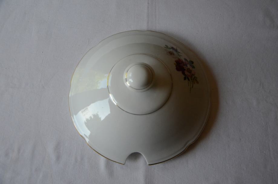 Stari porculanski poklopac za jušnik, sa pozlatom, vanjski promjer cca 25 cm, odlično očuvan, mali tragovi korištenja vidljivi sa unutarnje strane oboda - stanje je vidljivo na slikama.