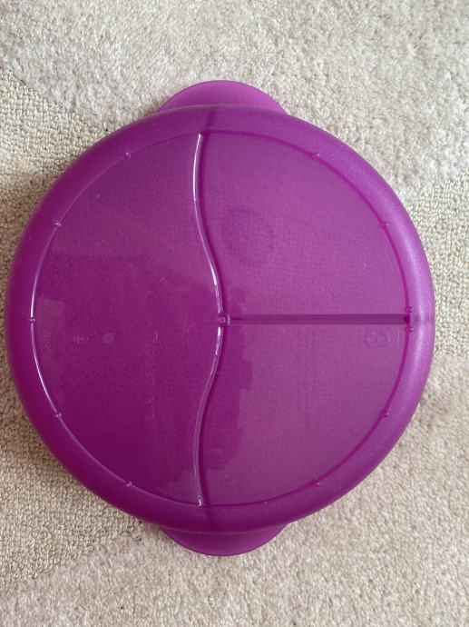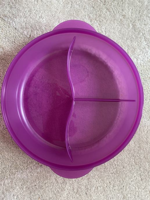 Potpuno nova Tupperware posuda s odjeljcima. Dimenzije: promjer 26 cm, visina 7 cm. Namjenjena je i sigurna za korištenje u mikovalnoj (nožice na dnu posude).