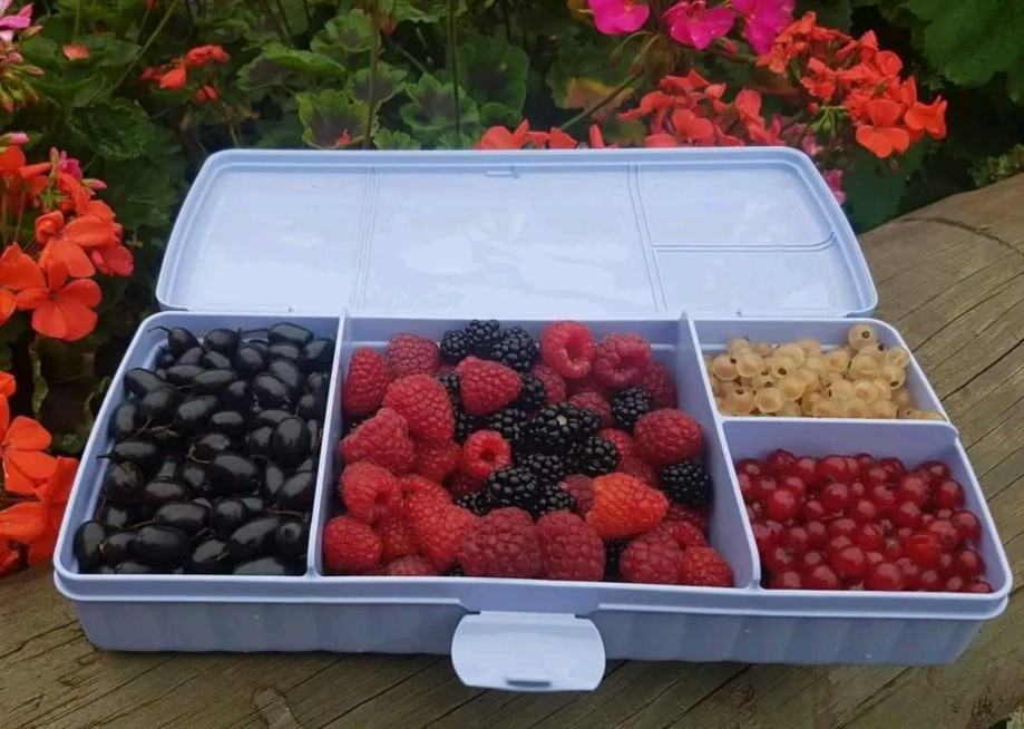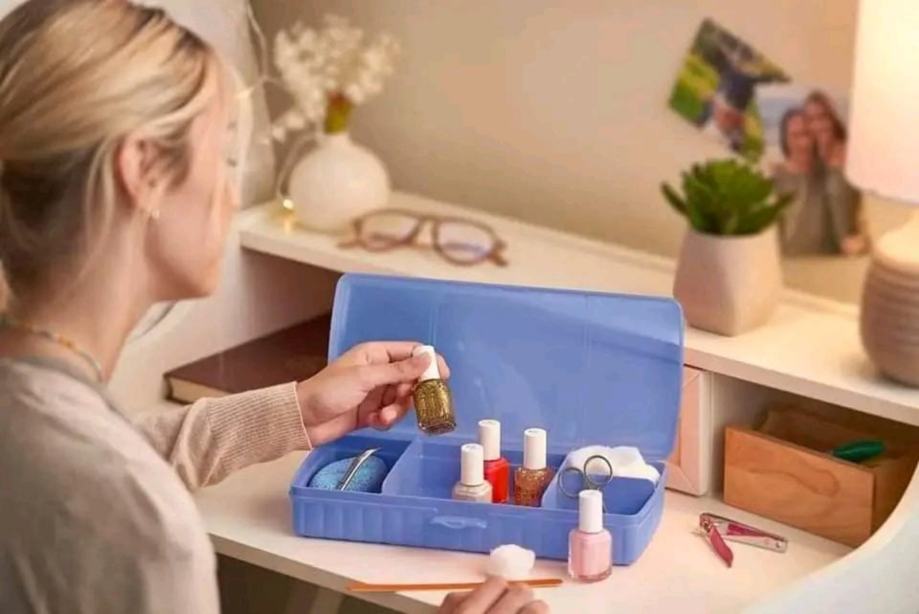 Kutija s pregradama za odlaganje gumica i špangica za kosu, igla i konaca, ili za udice za pecanje.