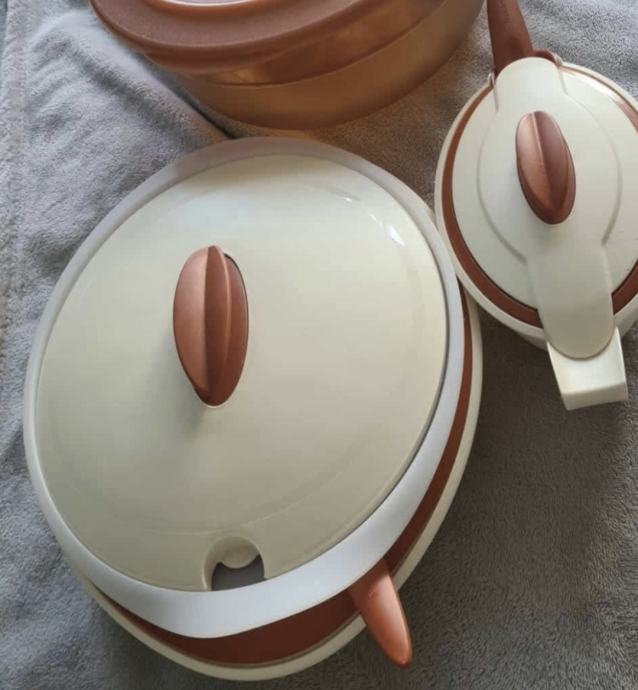 Posuda s poklopcima i žlicom , manja posuda s poklopcem i šefljicom za umake.