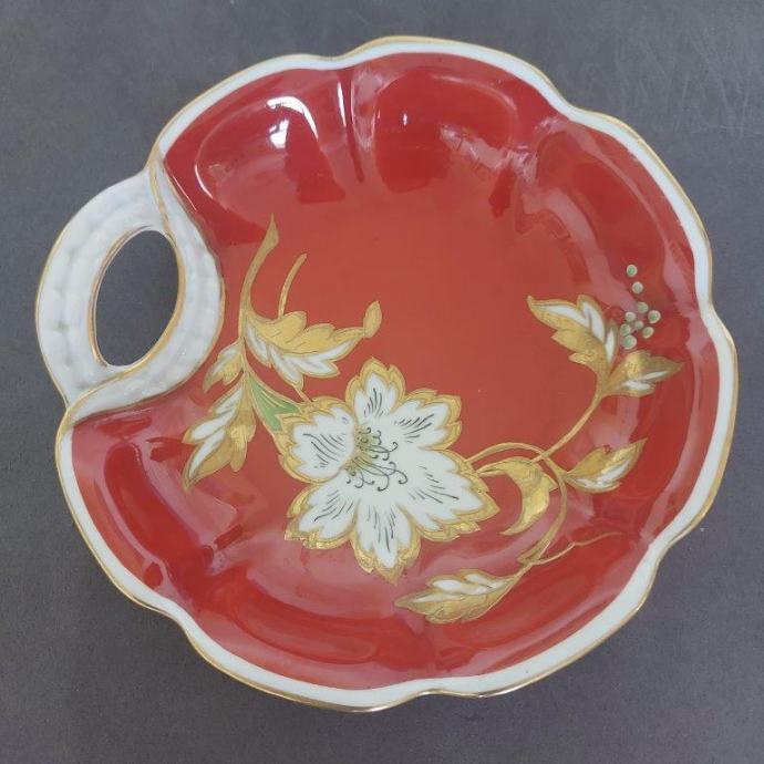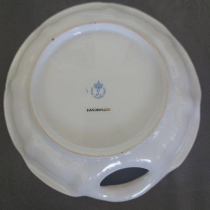 Porculanska ukrasna zdjela, ručno oslikana cvjetnim uzorkom sa pozlatom. Na dnu plavi znak Oscar