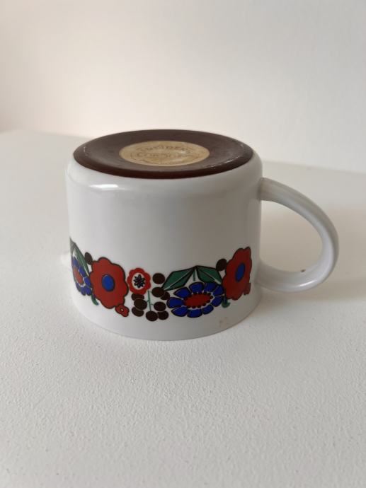 Vrč ima prepoznatljiv retro cvjetni motiv u crvenim, plavim i zelenim tonovima, tipičan za dizajn 70-ih godina, mid-century.