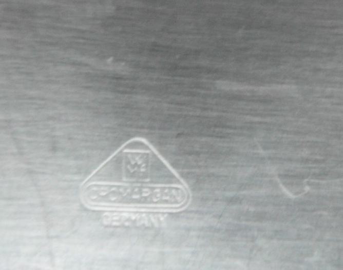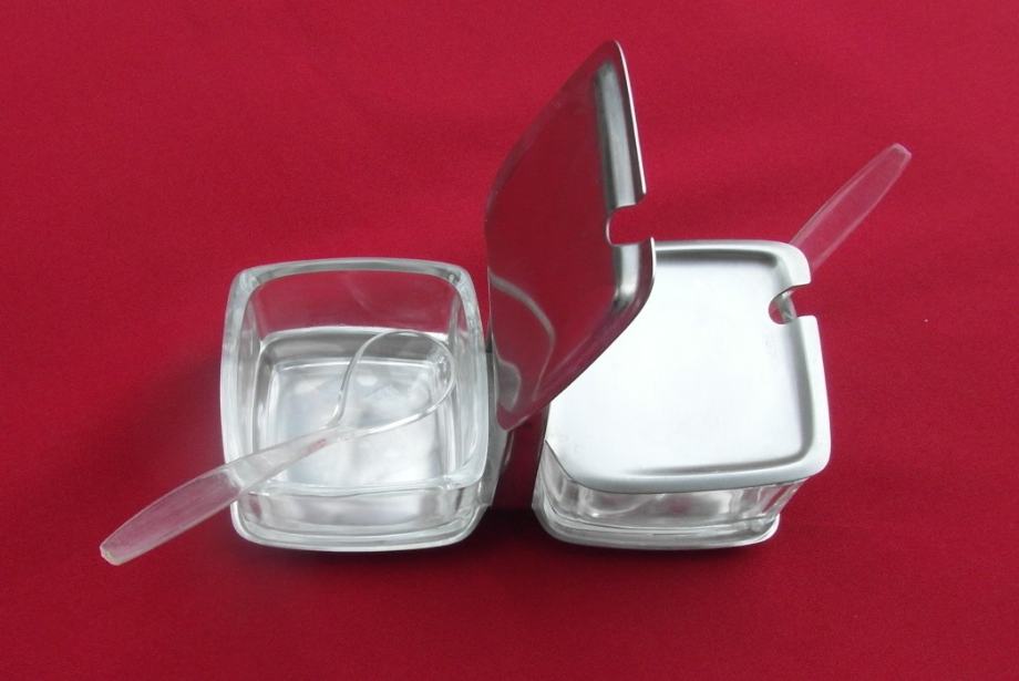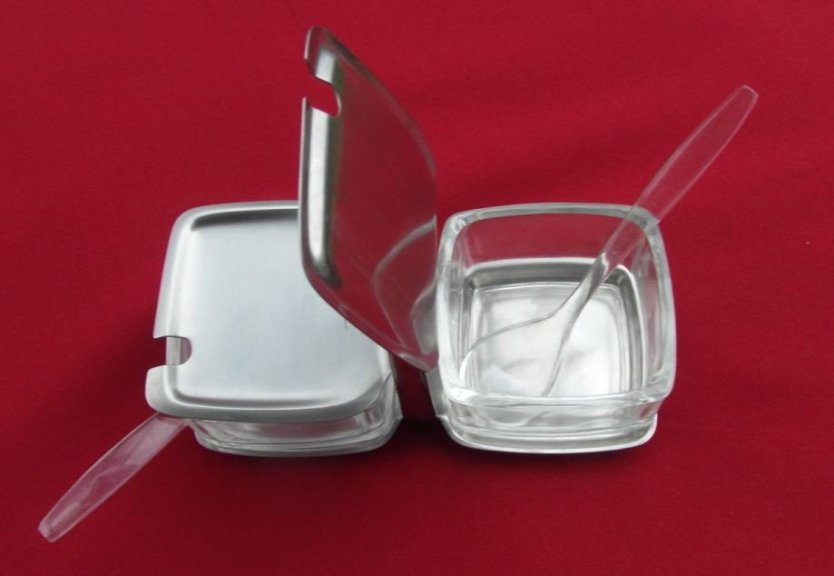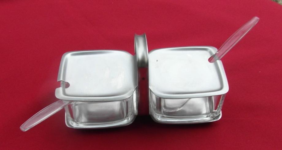 WMF Cromargan nehrđajući čelik 18/8. Proizvedene u Njemačkoj, suvremene moderne zdjele za šećer ili marmeladu/džem DVOSTRUKA posuda za staklenke s 2 žlice za posluživanje, donja 2 pladnja drže staklene zdjele, a gornja 2 poklopca su na šarkama radi lakšeg pristupa.