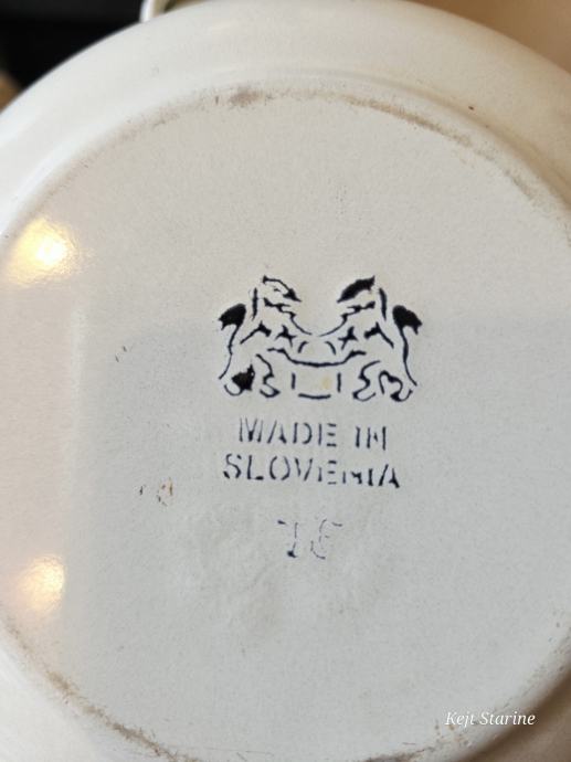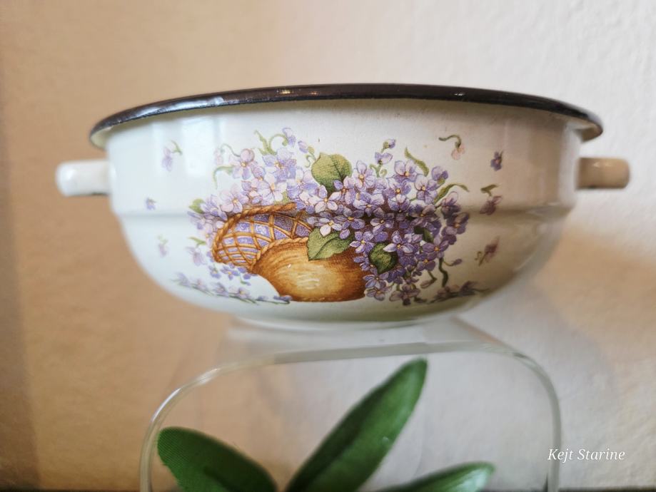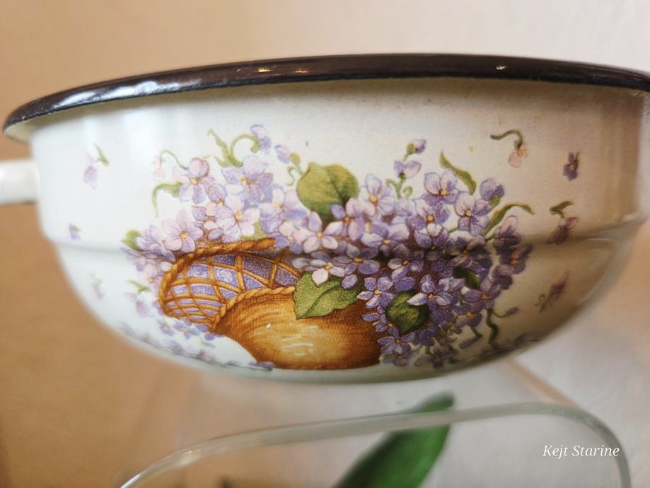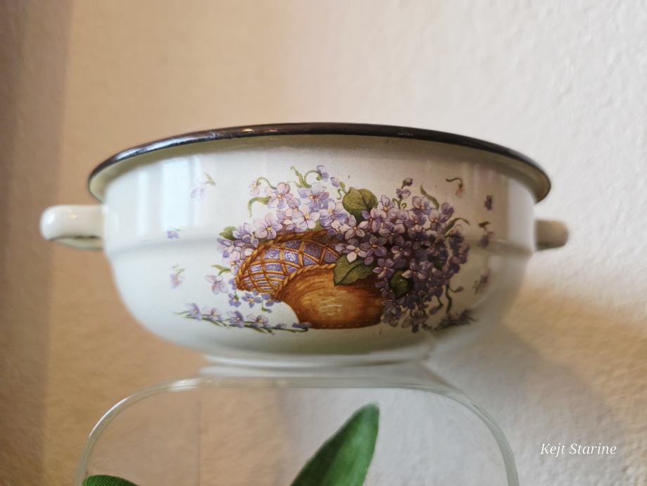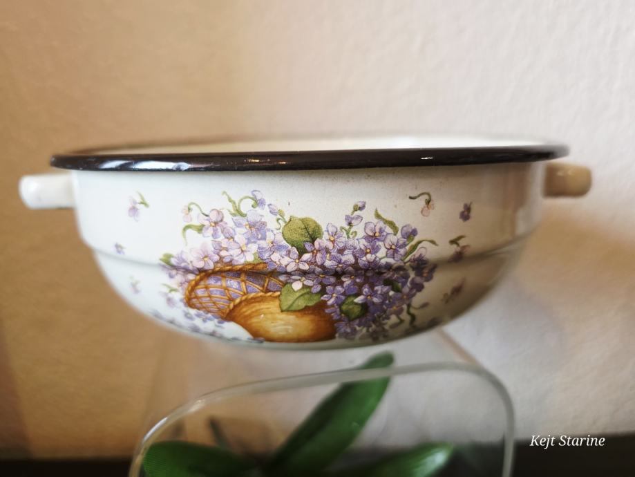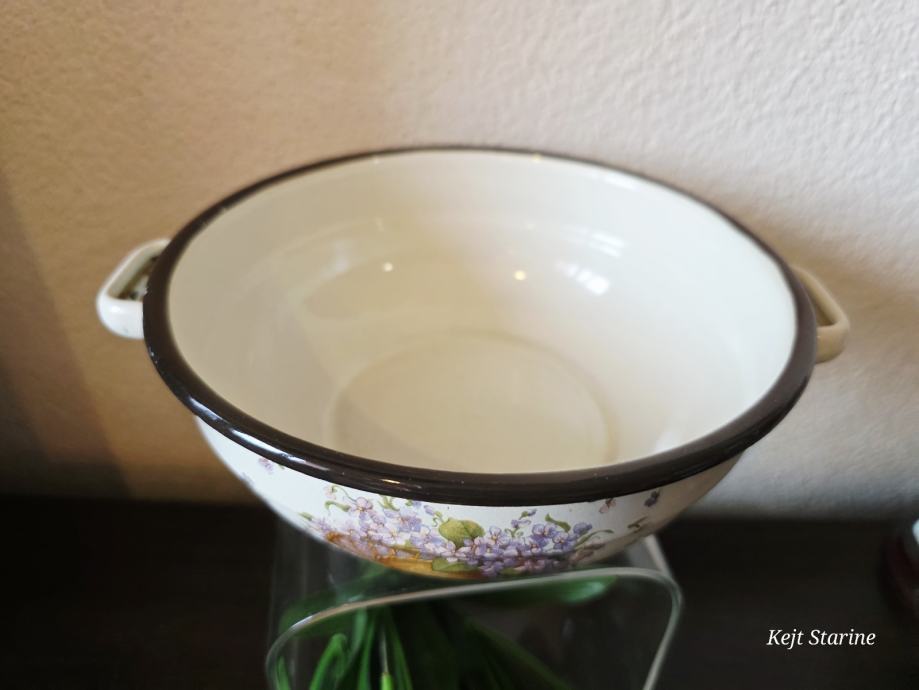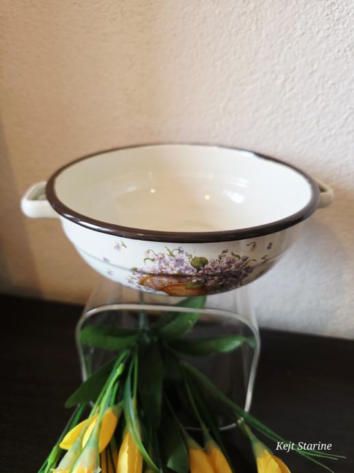 Zdjela, emajlirana posuda je proizvod tvrtke Emo Celje iz Slovenije, poznate po visokokvalitetnom emajliranom posuđu. Dizajn prikazuje košaru punu cvjetova nalik jorgovanu ili ljubičicama, što je bio popularan motiv na njihovim proizvodima.