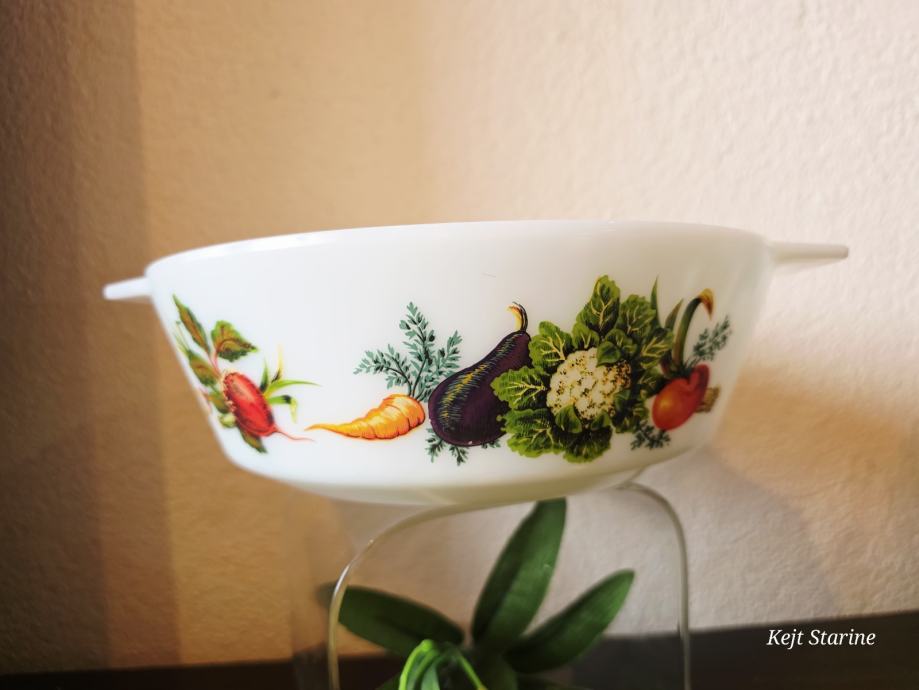 Uzorak: "Tuscany" ili "Market Garden", koji prikazuje šareni dizajn vrtnog povrća (patlidžani, mrkve, rotkvice, cvjetača) na bijelom mliječnom staklu.
