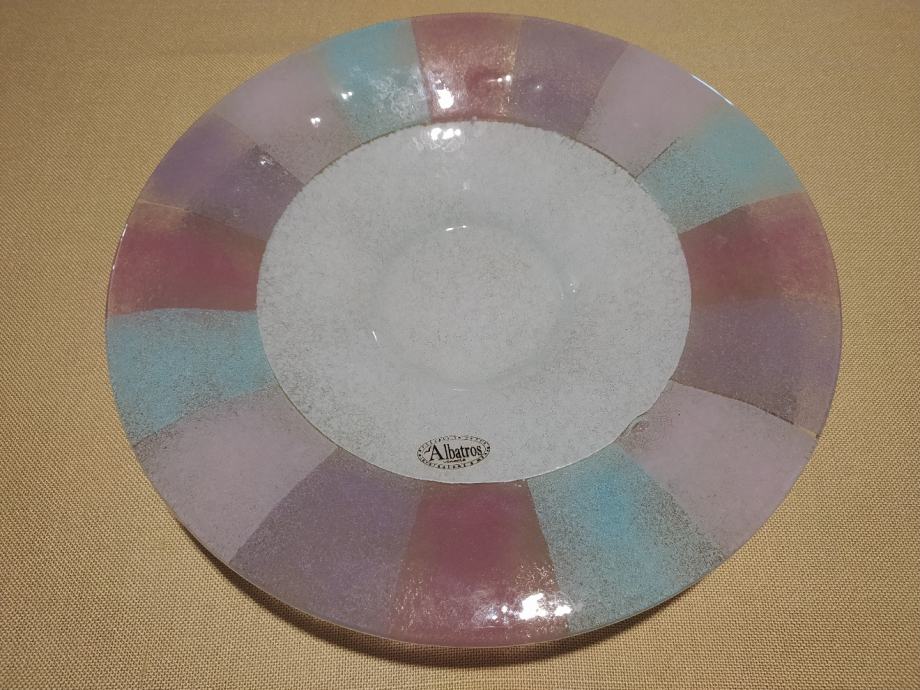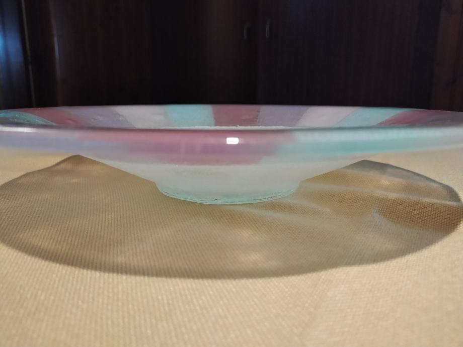 Prodajem novu (nikad korištenu) okruglu zdjelu modernog umjetničkog dizajna od venecijanskog stakla (Staklarska radionica "Albatros", Venezia (Italia)) ručne izrade (Fatto a mano) sa original kutijom.
