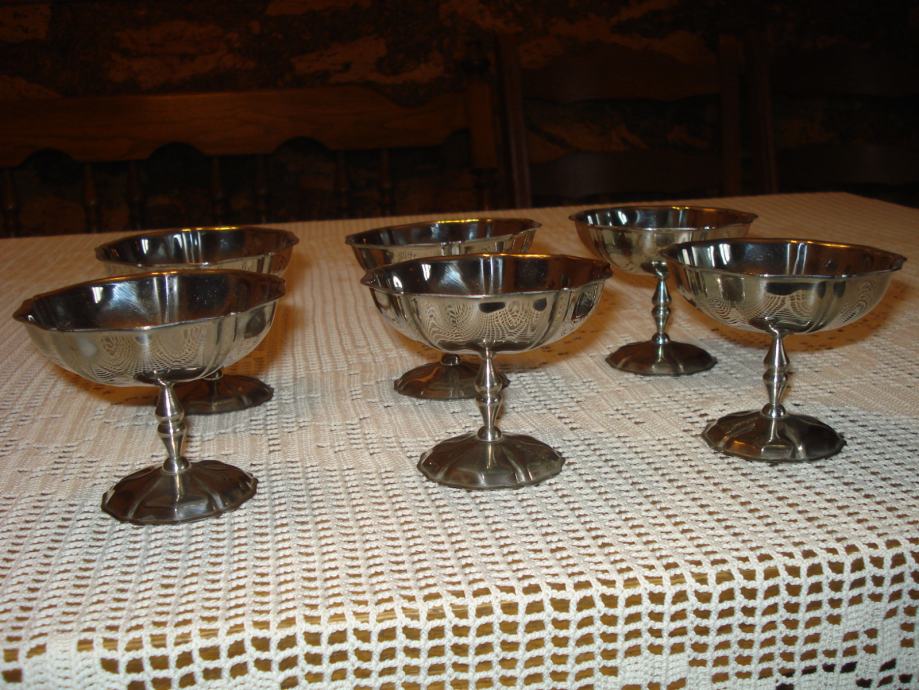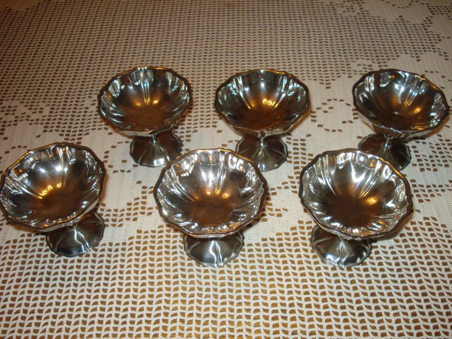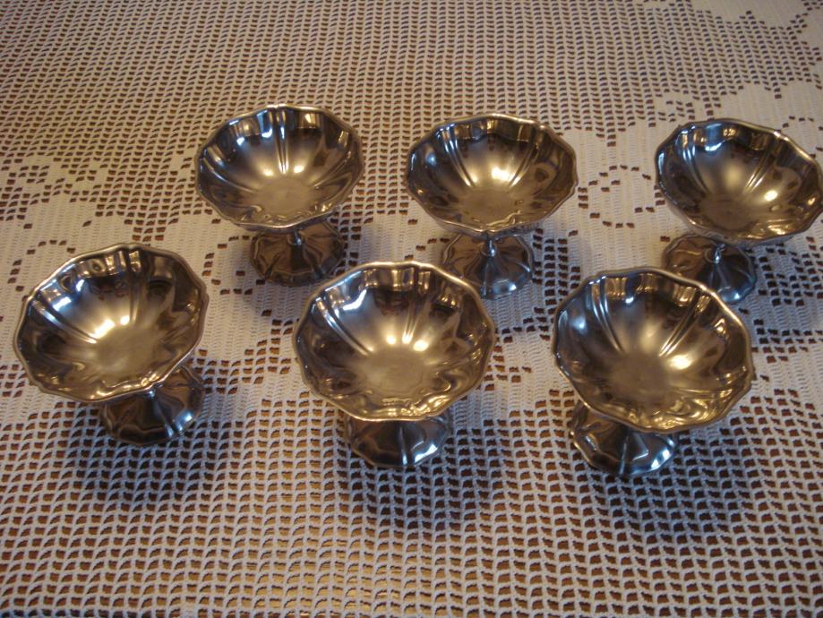 Set od 6 metalnih zdjelica na nožici. Ne znam od kojeg su metala, no niti nakon 15-tak godina stajanja u vitrini nisu izgubile sjaj.