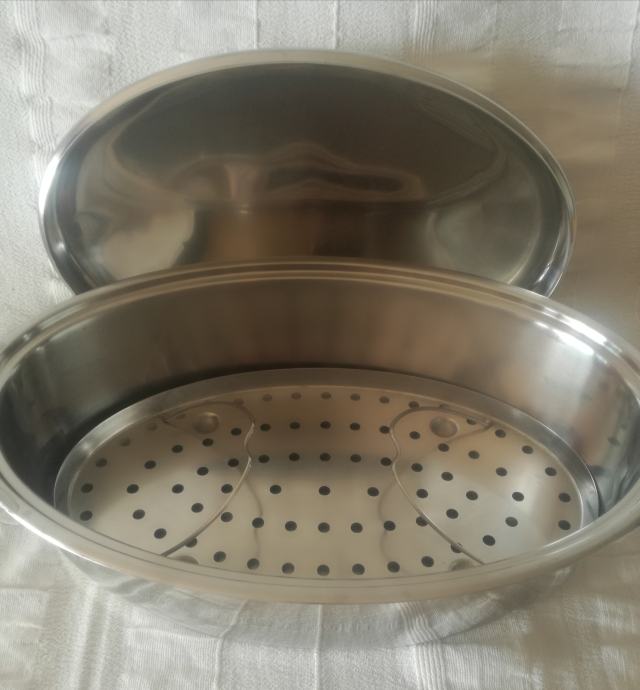 Prekrasno dizajnirana ovalna posuda neuništiva je i otporna na hrđu. Jedinstveni oblik, zaobljene strane i dubina olakšavaju okretanje i podizanje hrane. Uključuje posudu, poklopac, mrežu za odvajanje prilikom pečenja.