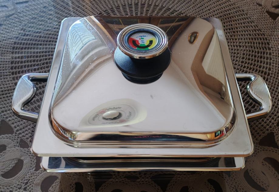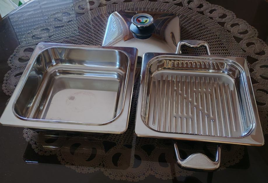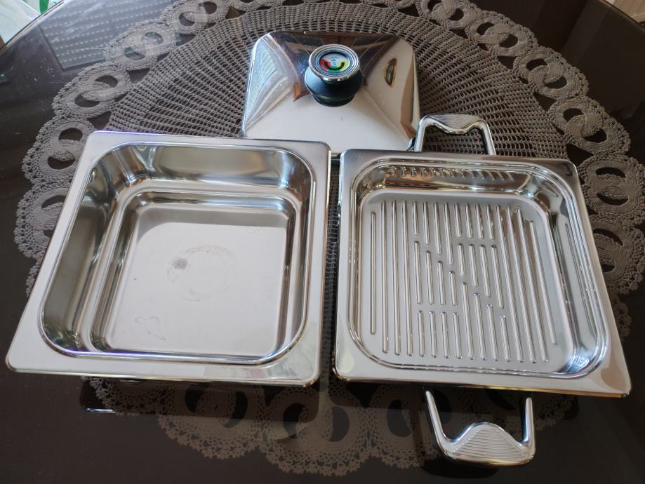 Prodajem Zepter Quadro grill tavu s poklopcem i dodatnom posudom za kuhanje na pari, dimenzija 23 x 23 cm, tava je visine 5,5 cm, a posuda 8 cm. Korištena svega nekoliko puta.