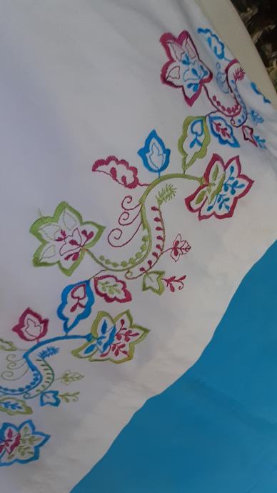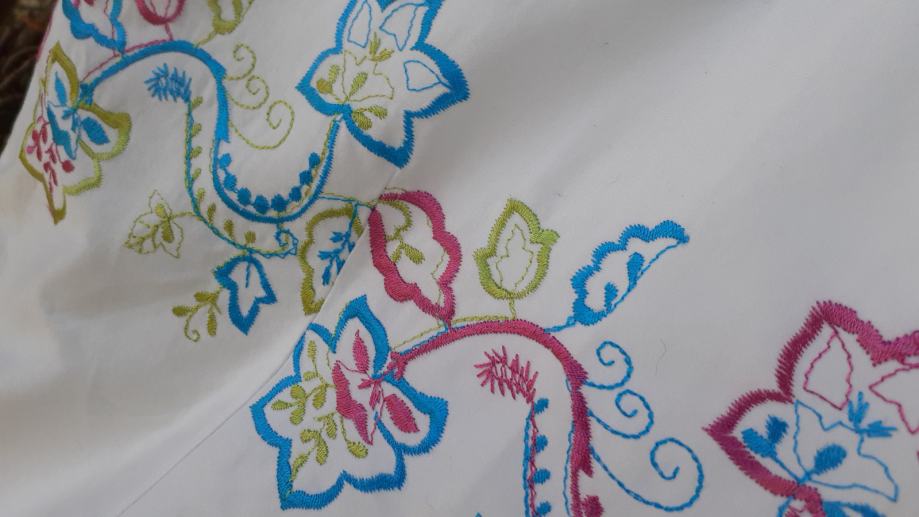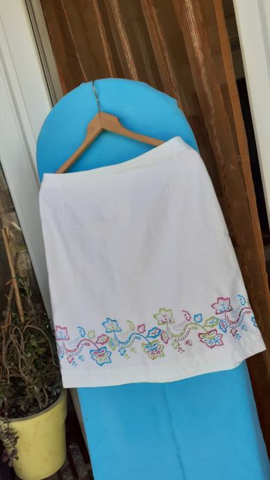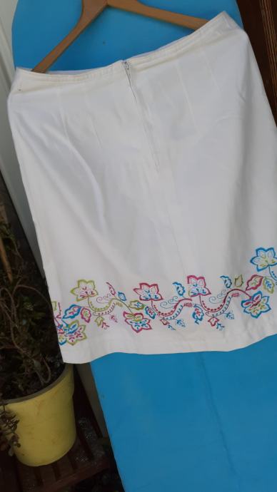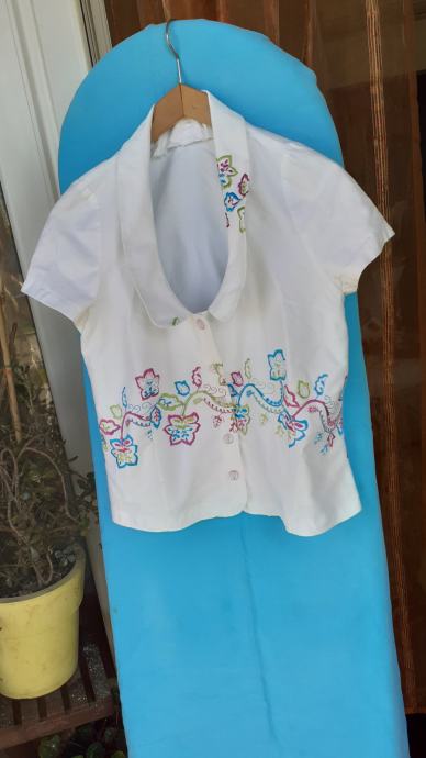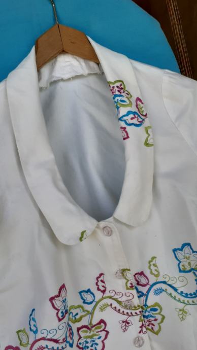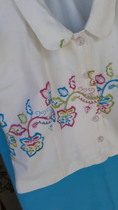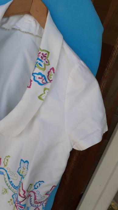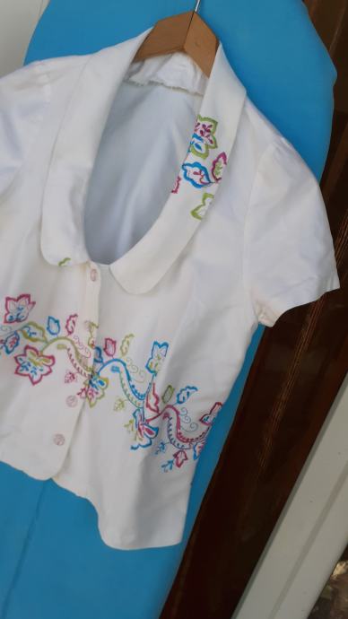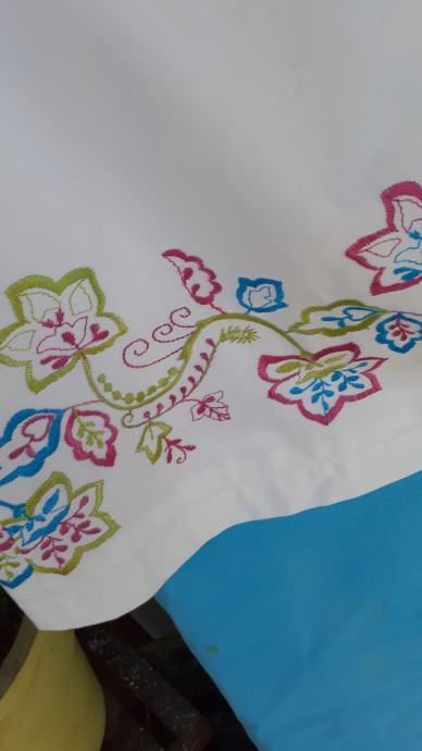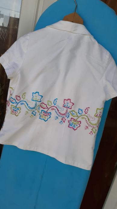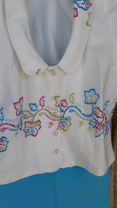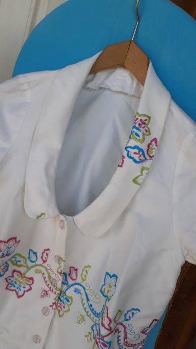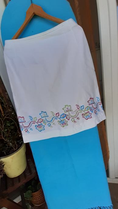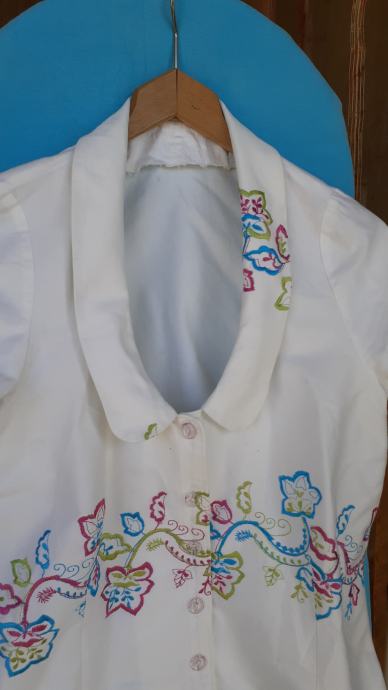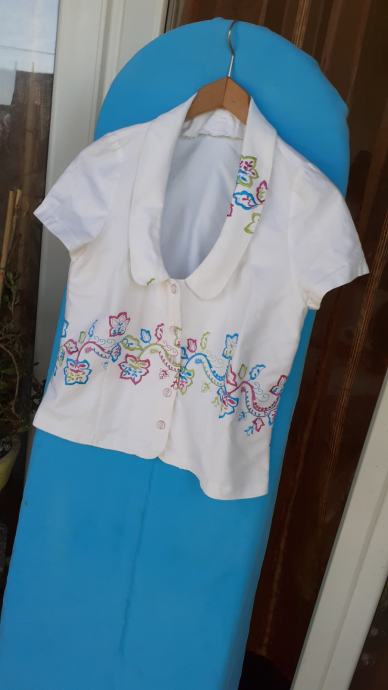 Novi komplet, bluza i suknja sa vezenim cvjetnim motivom, od finog mekog kvalitetnog pamučnog materijala. Bluzica je kratka, kopča se dugmetima, sa predivnim izrezom i kragnicom, te malim rukavima. Suknja je uska, malo se širi prema rubu, moje osobne izrade. Lagano, ugodno, prozračno, bez greške.
