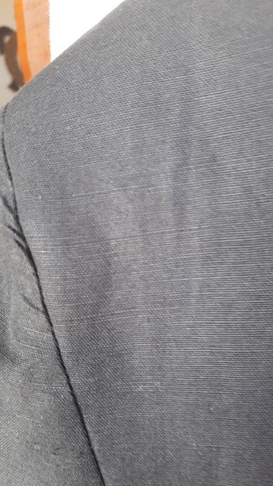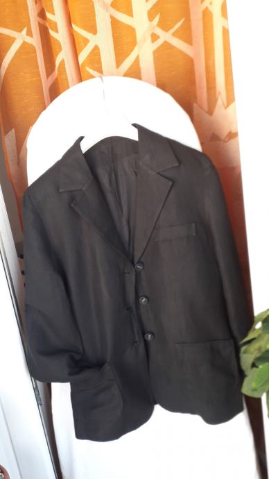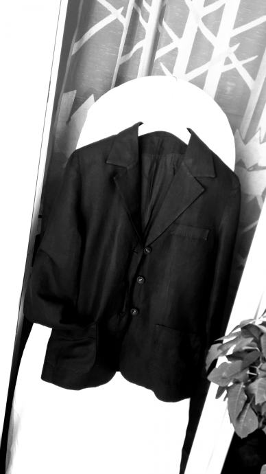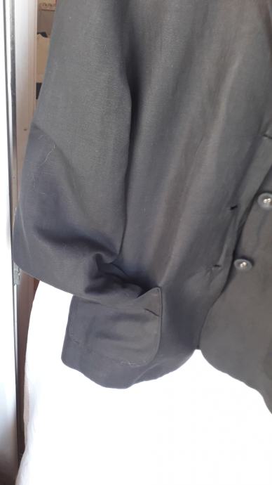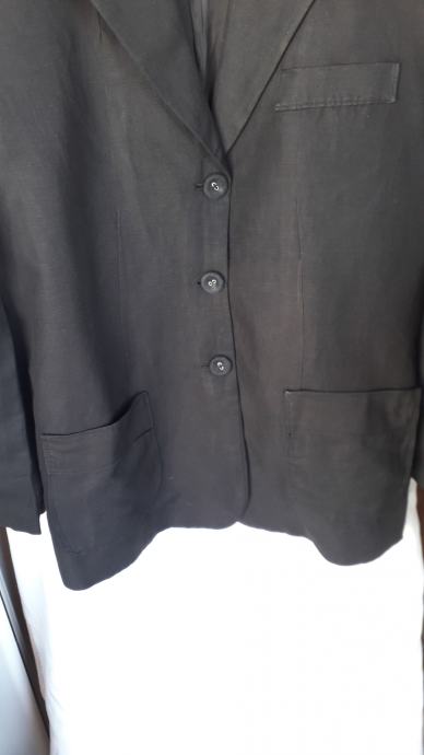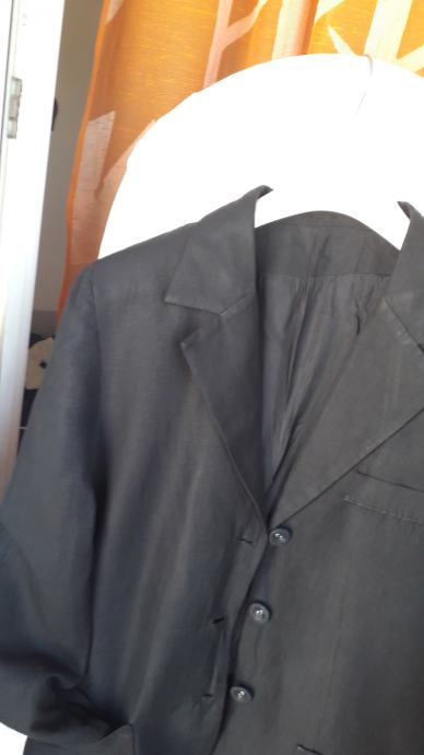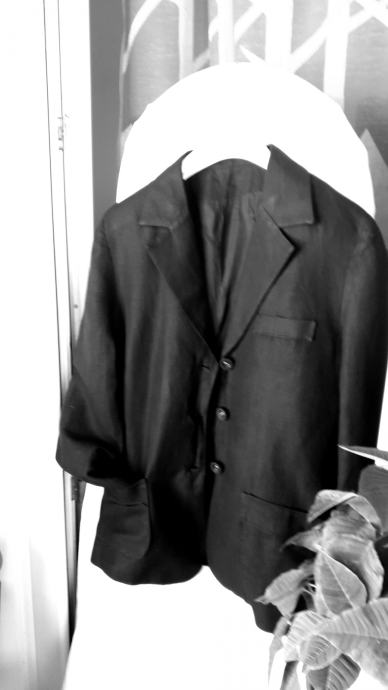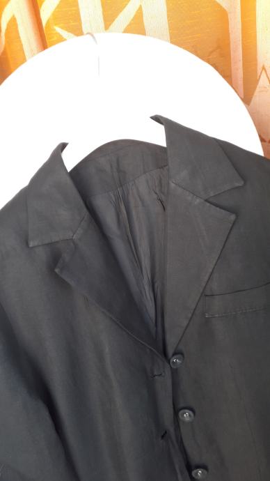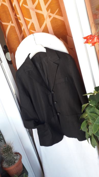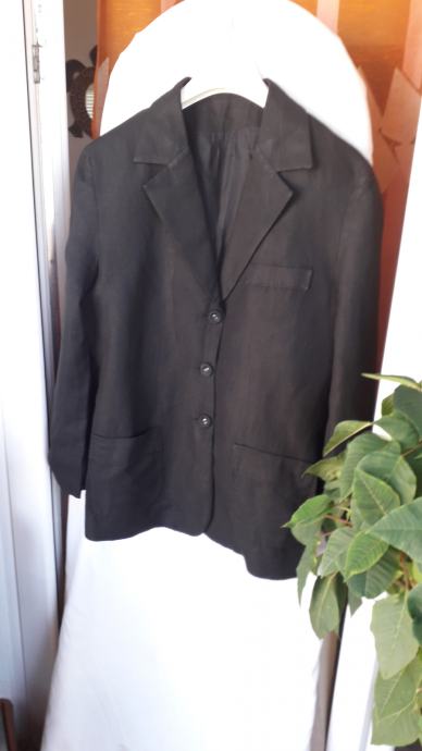 Vrlo ugodan, sako od pravog lanenog materijala, lagan, prozračan, podstavljen, trid dugmeta,dva vanjska džepa. Može se nositi u kasno proljeće ili ljeti, bez greške. Moj rad po mjerama za mene, pomoću njemačkog časopisa Burda, koji ima vrlo precizne krojeve i mjere, a savršeno odgovaraju našim mjerama-njemačka preciznost. Širina od pazuha do pazuha 55 , dužina rukava od pazuha do ruba 43, dužina od pazuha do ruba 47 cm.