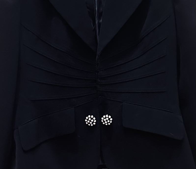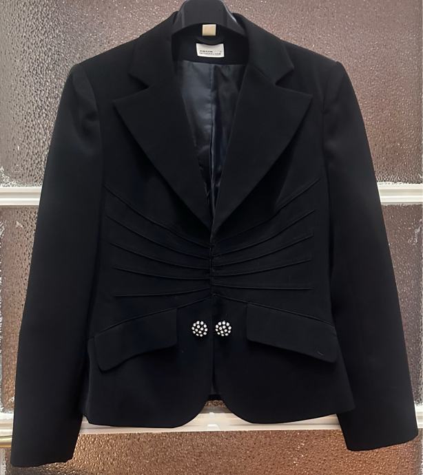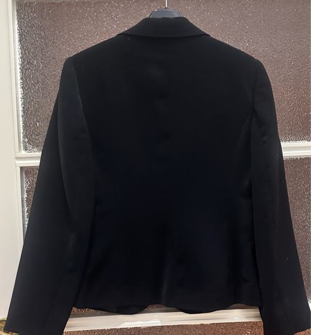 Crni sako broj 36, širina ramena 40 cm, dužina rukava 58 cm.
