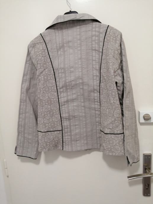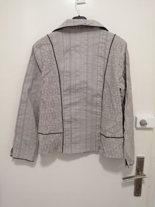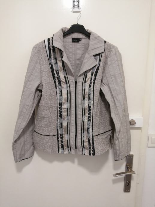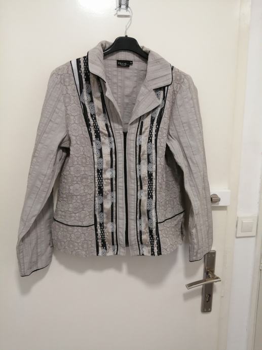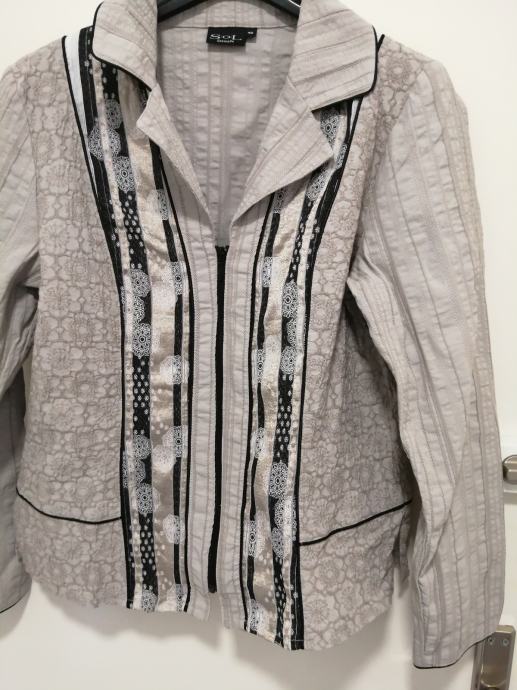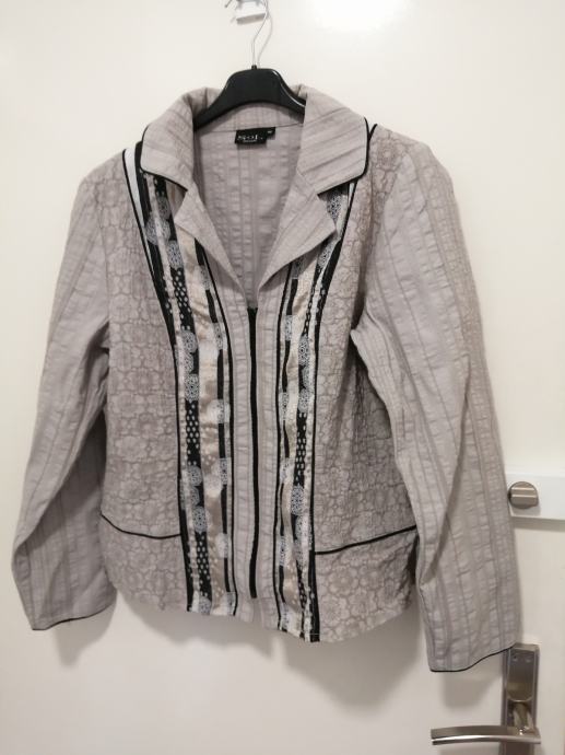 Moderan bež sako, vrlo meobičan. RAđen od kvalitetnog materijala (70 % pamuk, 25 % poliester, 5 % elastin). Kao nov, bez tragova nošenja. Različite teksture materijala koje se savršeno uklapaju u cjelokupni dizajn. Ima i jastučiće koji se mogu s lakoćom skinuti. Piše broj 42.