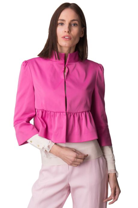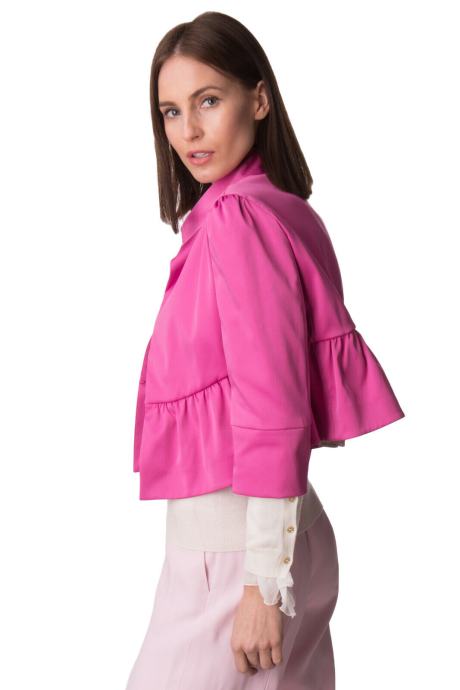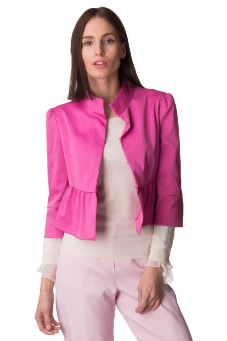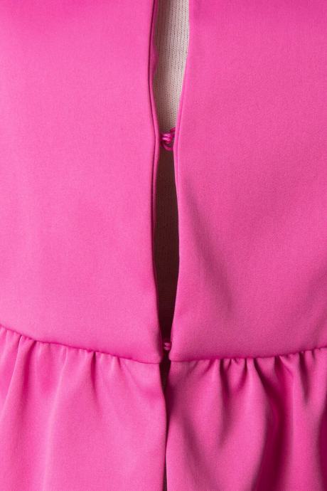 Svila/saten, roza boja. Peplum na struku. Rukavi ravni.