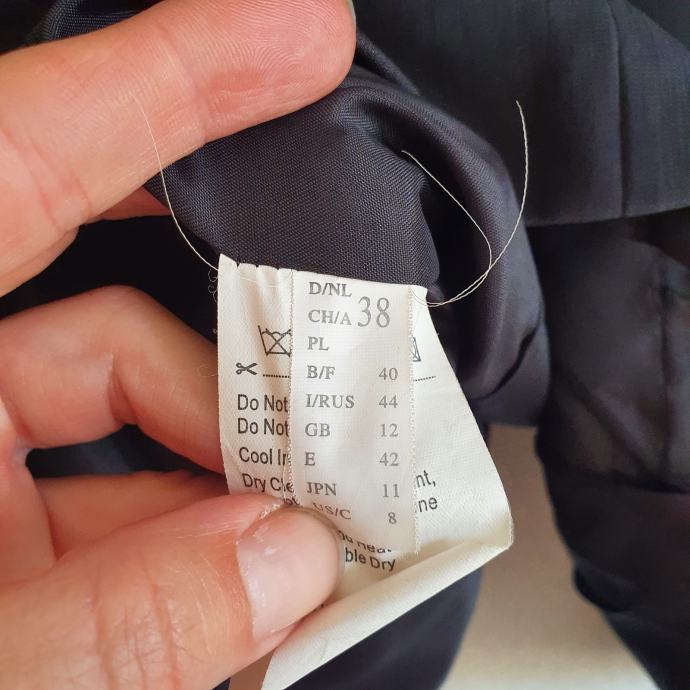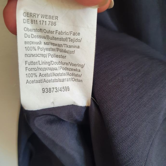 Crni poslovni sako Gerry Weber talijanska veličina 44 odgovara našoj veličini 38. Mjere su ramena 45 cm, prsa oko 48 cm, rukavi 53 cm, dužina 66cm. Sastav je izvana 100 % poliester, sastav iznutra je 100% acetat.