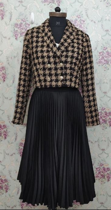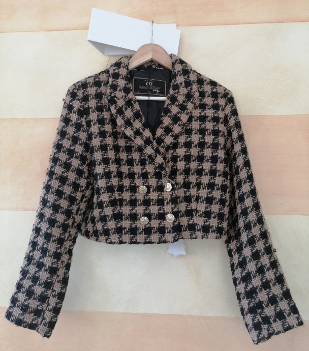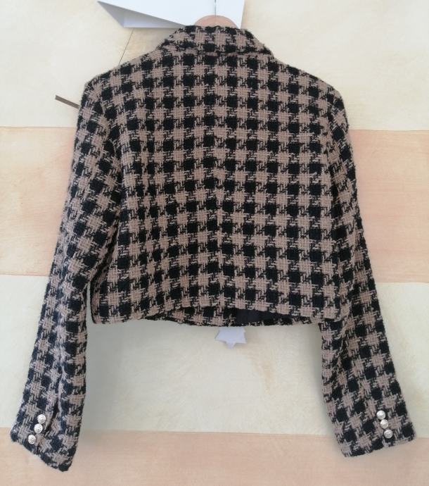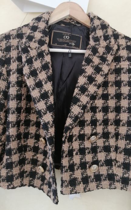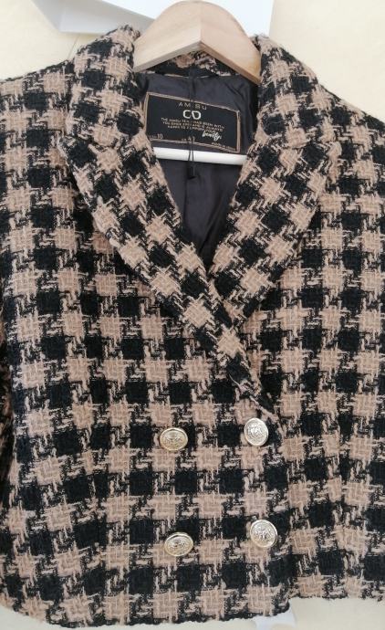 U kombinaciji crne i bež boje s dvorednim zlatnim gumbima.
