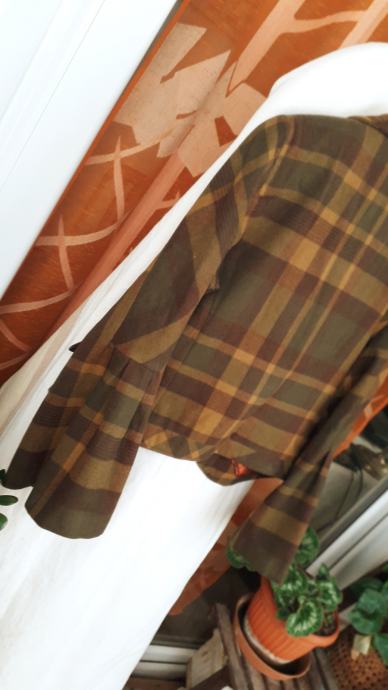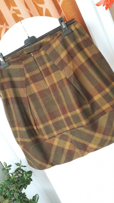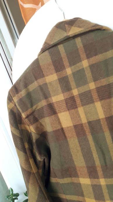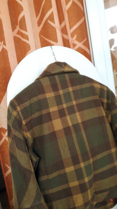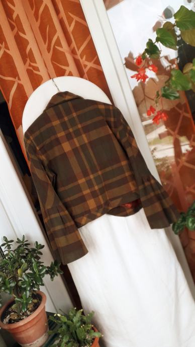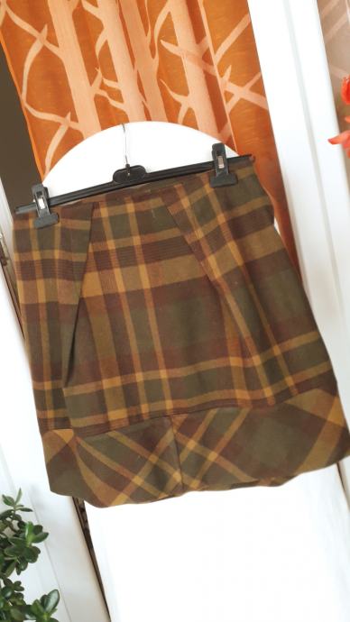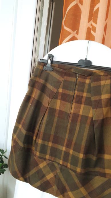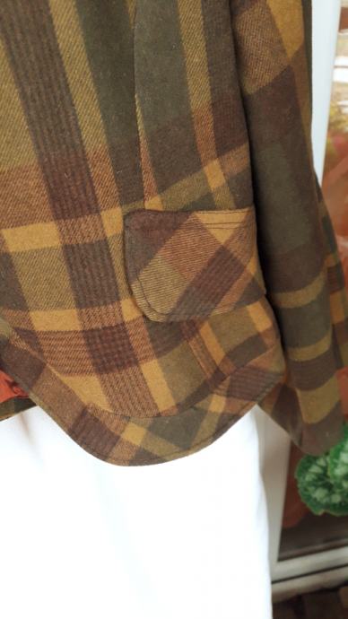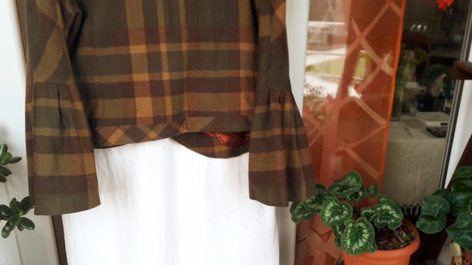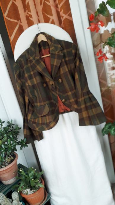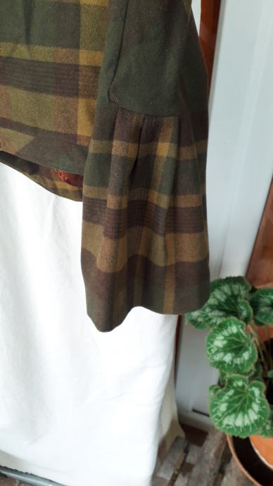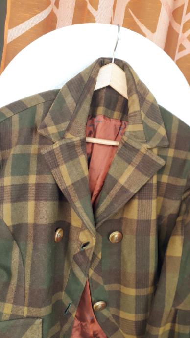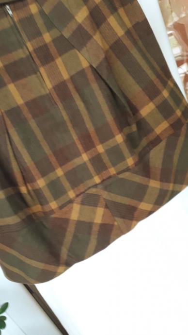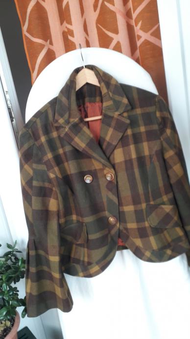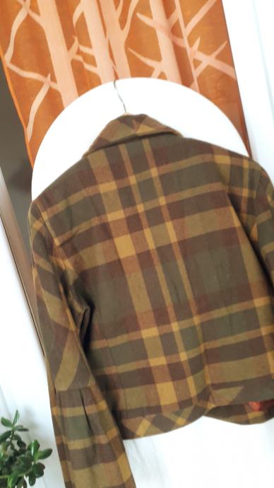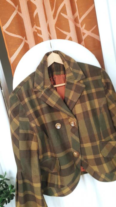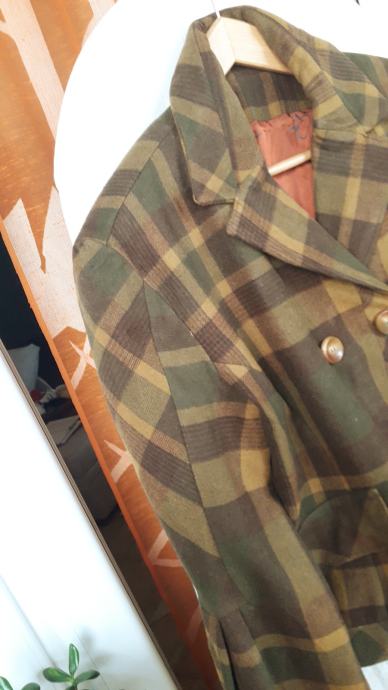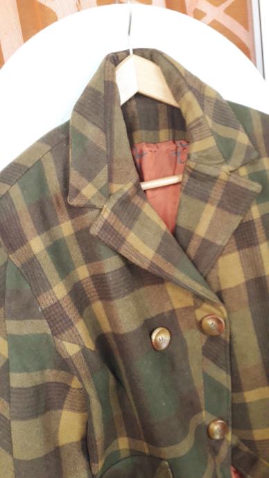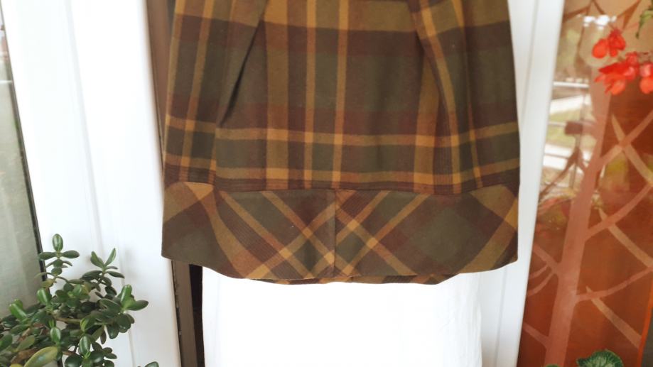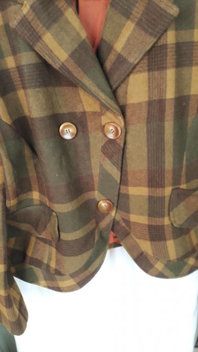 Kratka jaknica strukirana, uz tijelo, ali komotna, plisirani rubovi rukava, udobna, topla. Materijal je 100%vuna, široki rukavi, kopčanje na tri velika dugmeta. Širina od pazuha do pazuha 57, dužina rukava od pazuha do ruba 42, širina ramena 45. Suknja do koljena, balon oblika, kopčanje iza, na manje falte ispred i iza u struku, podstavljena. Širina struka 42, dužina 50 cm. Kao novo, par puta obučeno. Vrlo je topli komplet, pa se može nositi u kasnu jesen ili zimi. Boje su vjerne, slikano na danjem svjetlu, kombinacije zelene, oker-žute i smeđe.