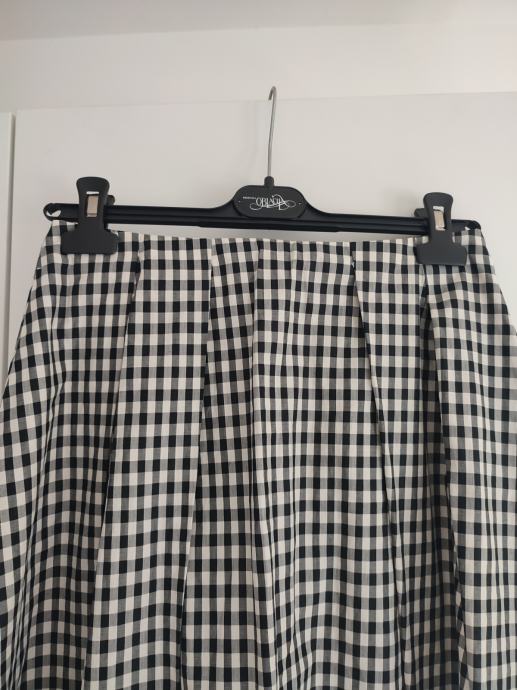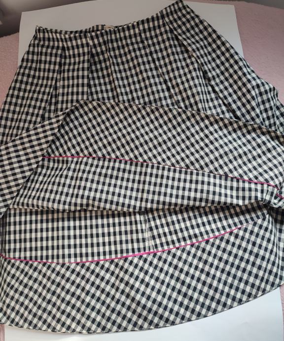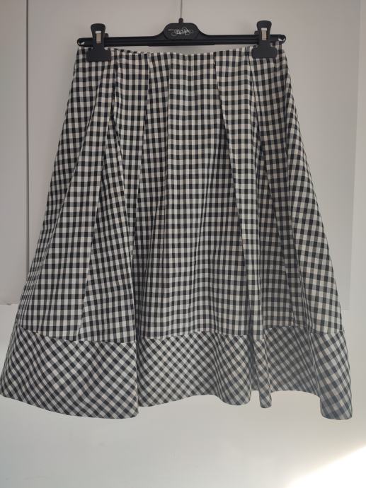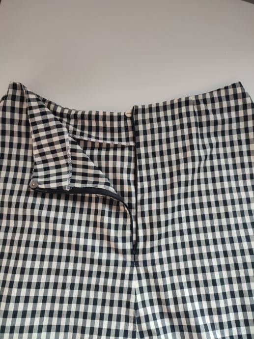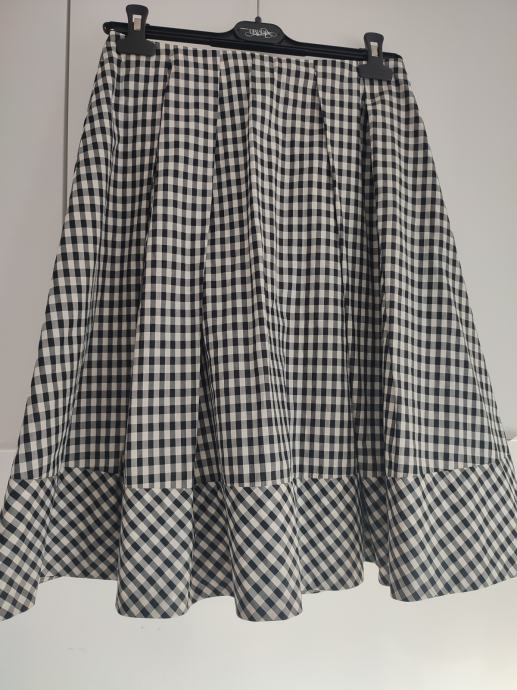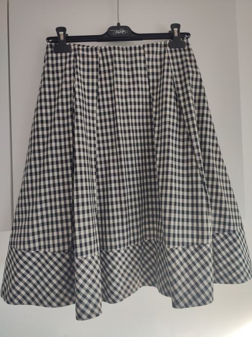 bez pasice u struku, može skliznuti na bok po želji i mogućnosti, kopčanje na patent dužine 21,5 cm na stražnjoj strani, 2 falde nepeglane prema unutra duboke 4,5 cm, 2 ušivena džepa na bočnim šavovima, volan na dnu suknje, volan je s unutrašnje strane našiven s rozom ukrasnom trakom uzorak suknje i jakete je isti, crno-sivo-bijeli karo - kockice ravne, a volan suknje ima kosi karo