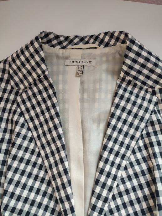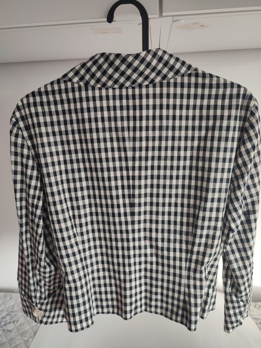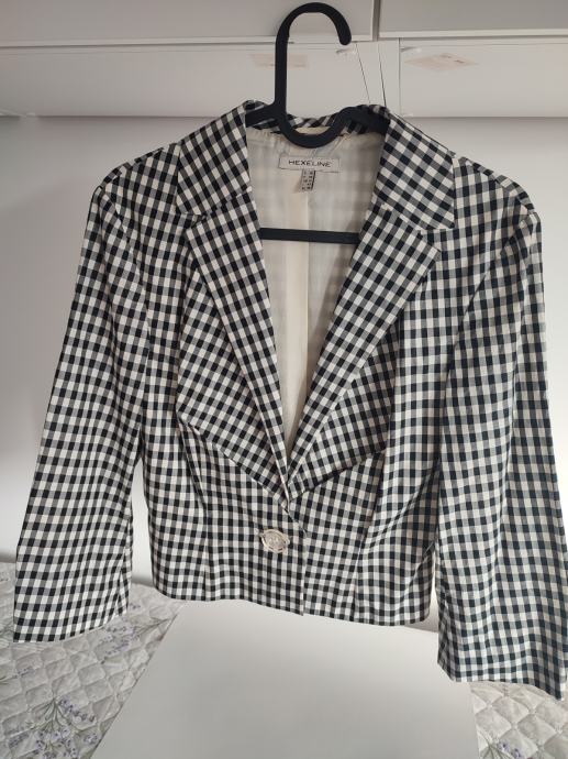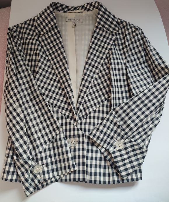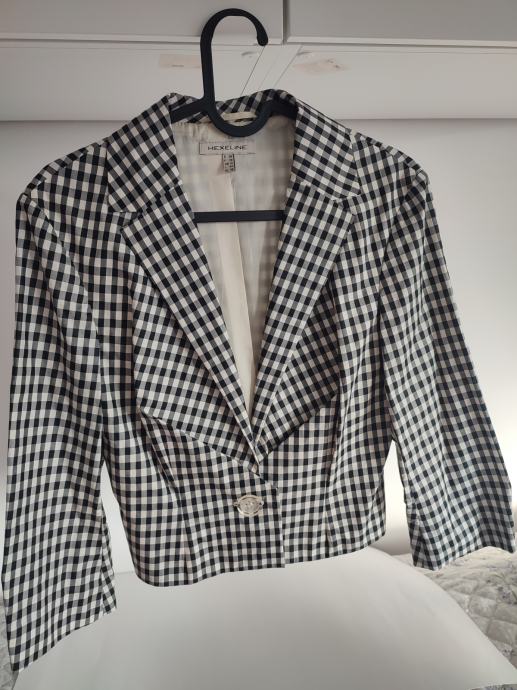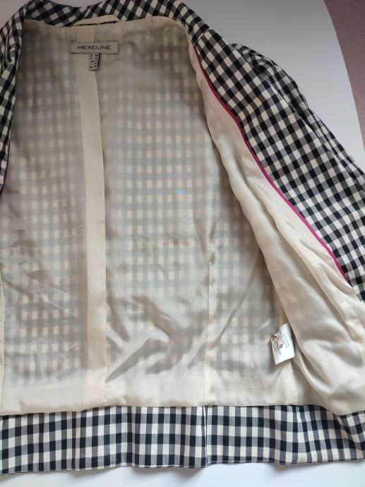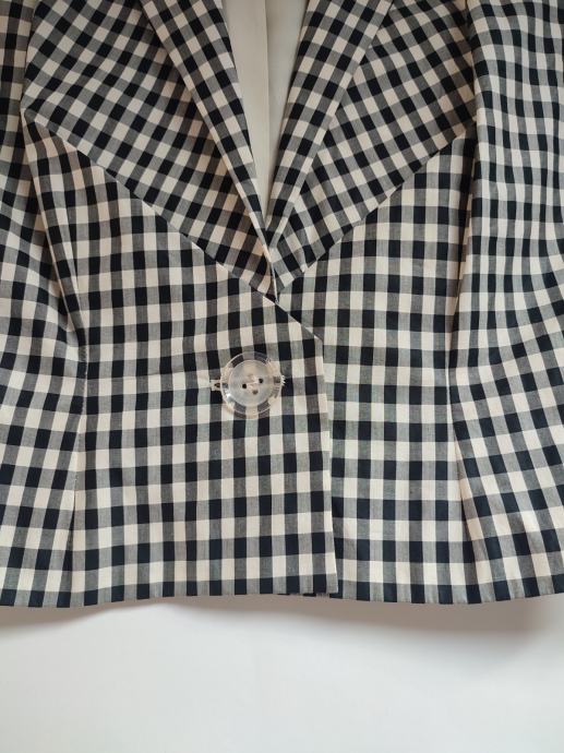 duboki izrez na V s kragnom, mala falda za prsi sa svake strane, kopčanje na jedan botun u struku, 3/4 rukavi, na stražnjoj strani rukava je mala falda s ukrasnim botunom, jakna ima podstavu osim na rukavima, podstava je obrubljena rozom trakom