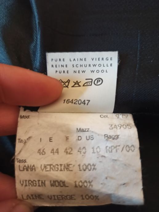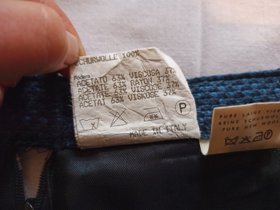 Kostim je od 100% vune, a podstava od mješavine acetata (slično svili) i viskoze.