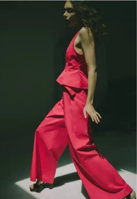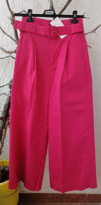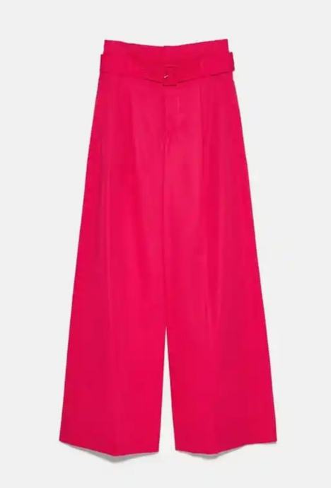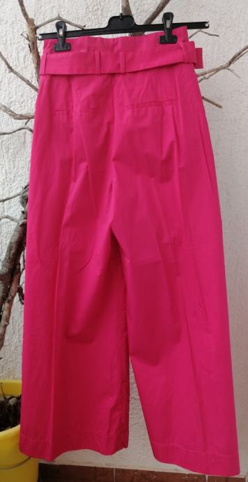 Hlače su širokih nogavica, s visokim strukom i remenom.