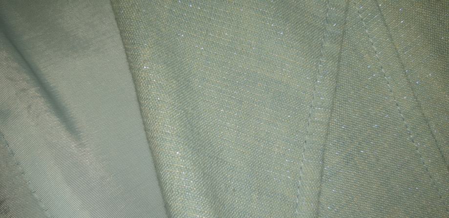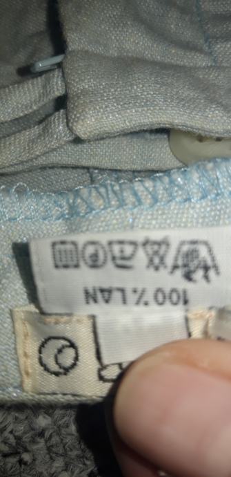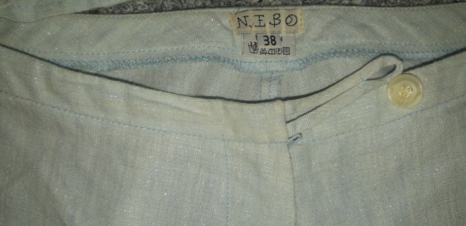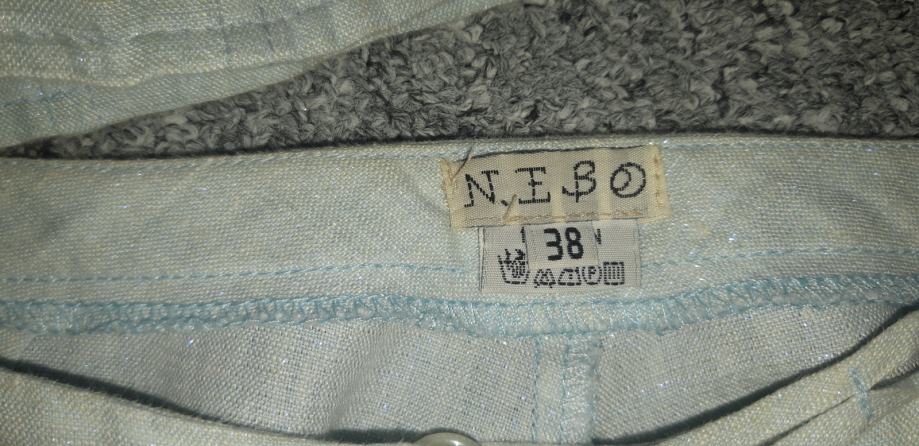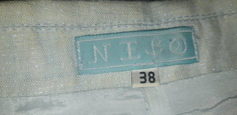 Prekrasan komplet,sako i hlace,jako skupo placeno,nasa marka nebo,materijal je 100 % lan,svijetlo plave boje a u materijalu su sljokice tamnije plave,vel 36-38....
