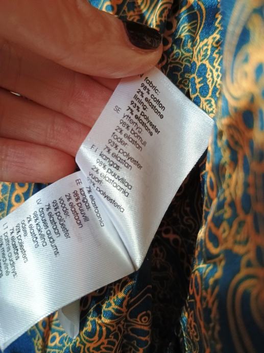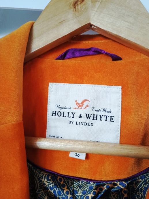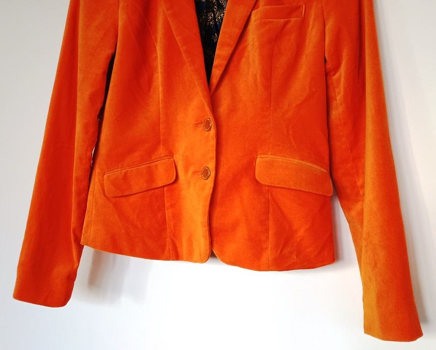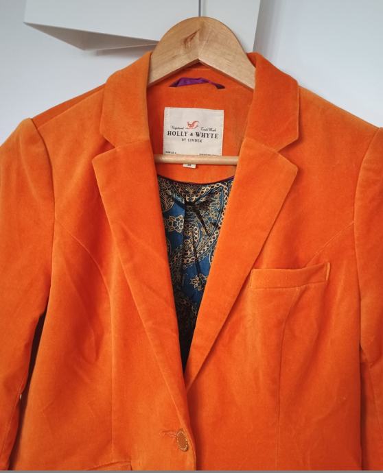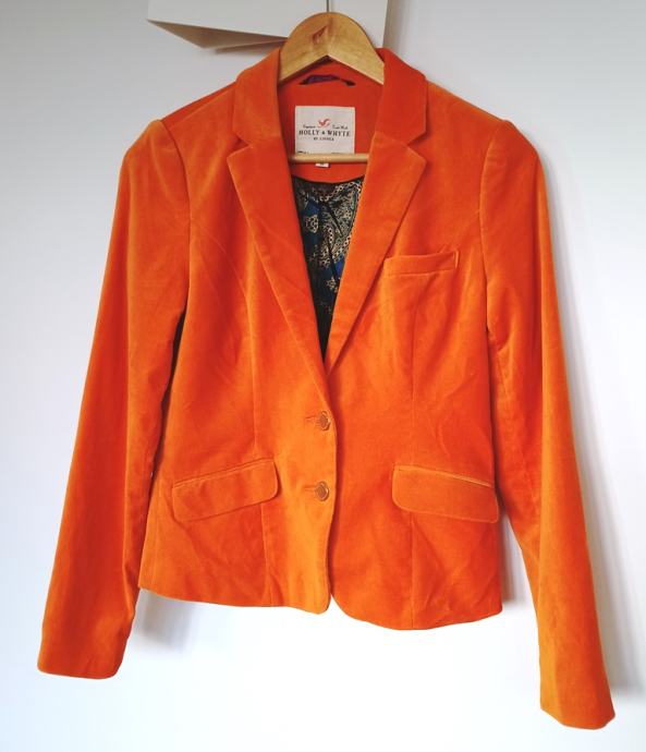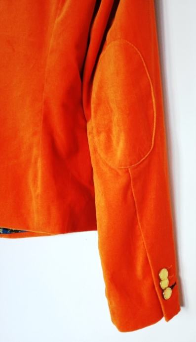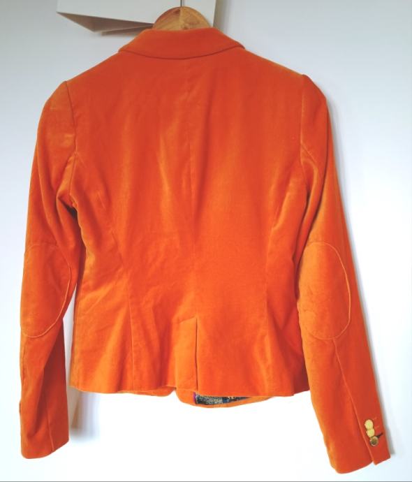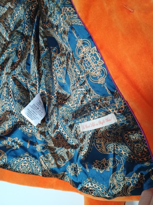 Tople narančaste boje, ukrašen zlatnim dugmima.