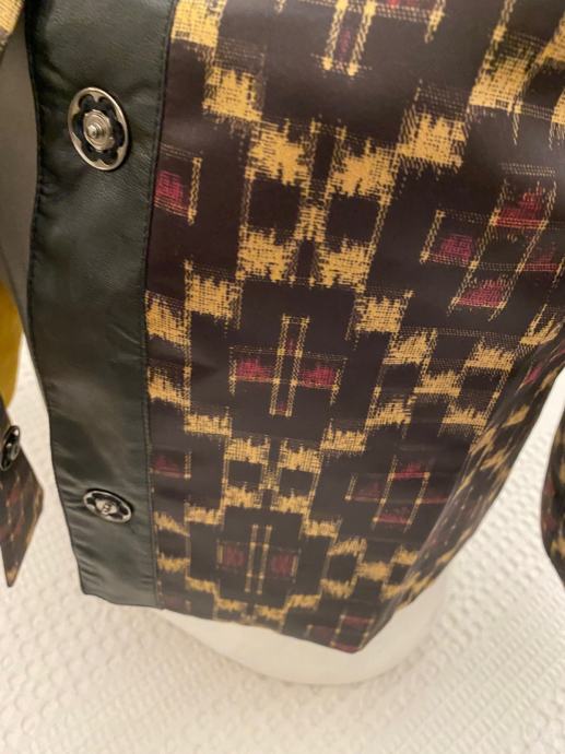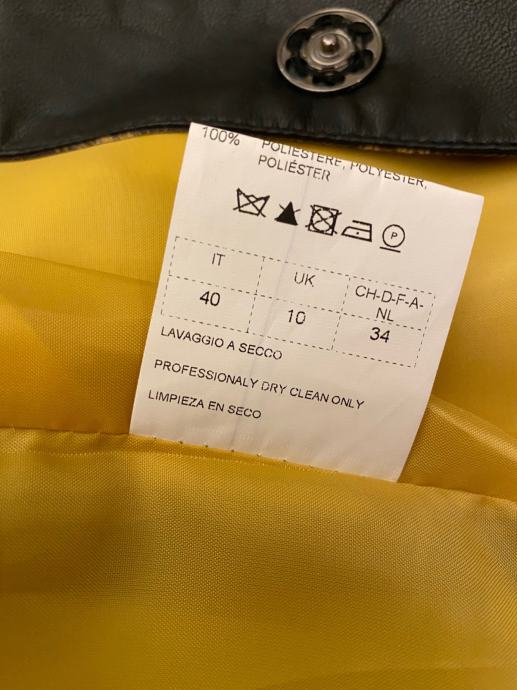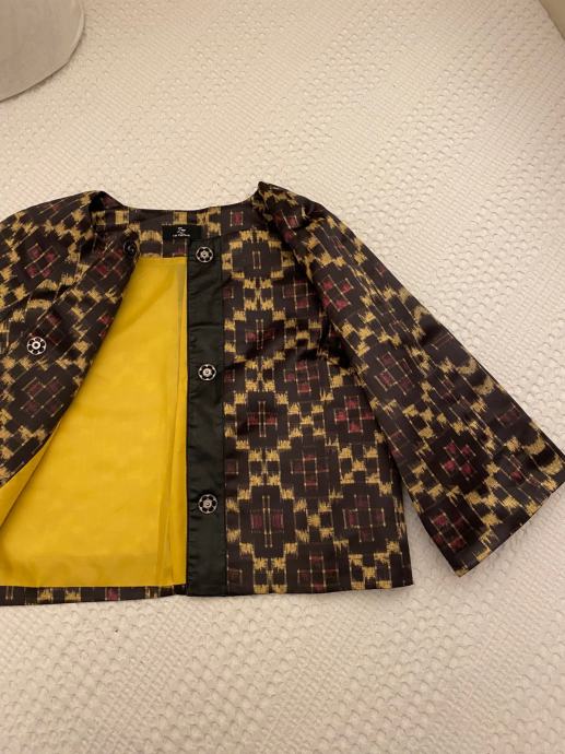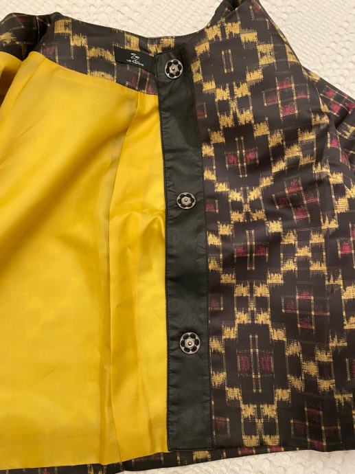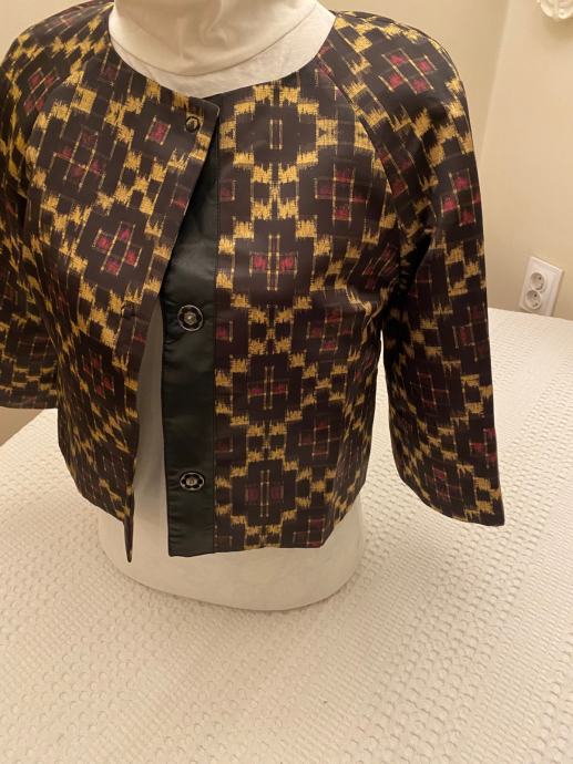 Smede, bordo, sa zlatno žutomi crnom i obrubljen kožom, retro-look. Kimono stil kratkog sakoa, super je preko dolčevite, košulje ili…podstavljen, ima kožni detalj i leptir 3/4 rukave. NOV je iz ZZ kolekcije talijanskg brenda. Materijal je kao svila- sjajnog izgleda.