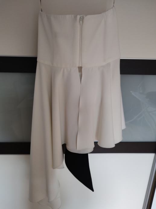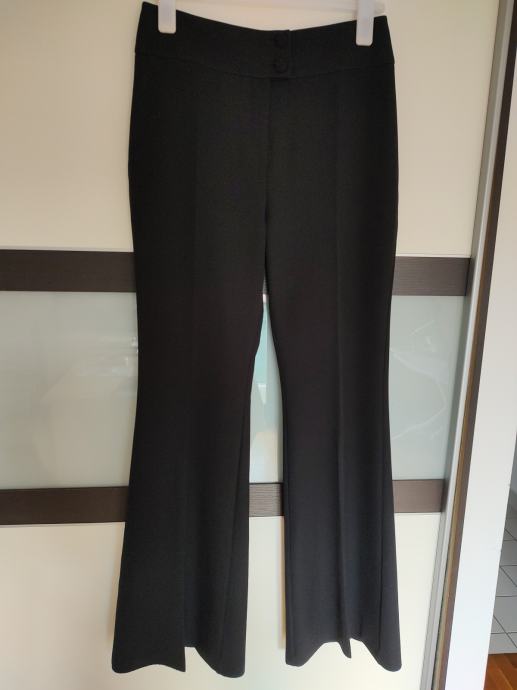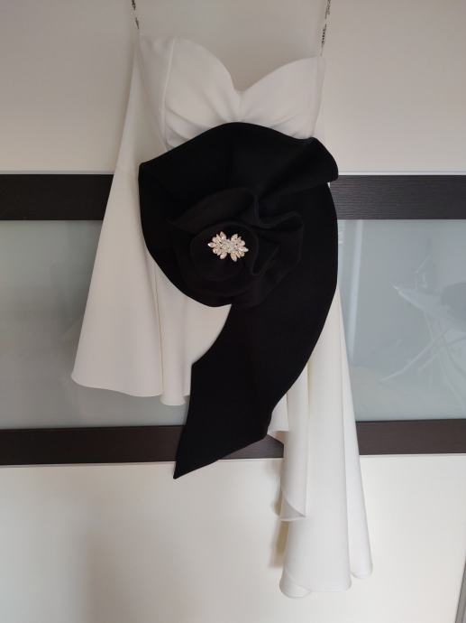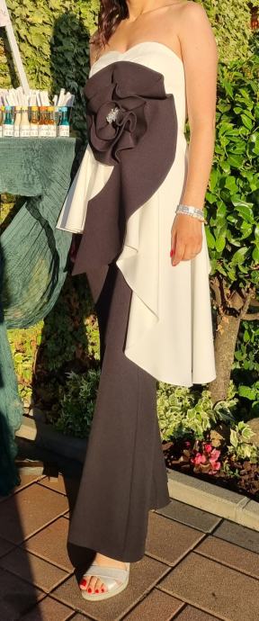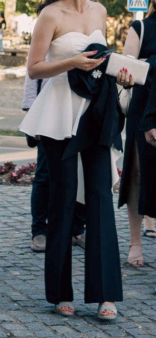Svečani komplet - top i hlače, nošen jednom u svatove, očišćen i spreman za ponovno nošenje. Asimetričan top s efektnom crnom ružom, patent je na leđima. Ima ugrađene košarice pa se može nositi bez grudnjaka. Svečane crne hlače na crtu, blago se šire prema dolje, dvostruko kopčanje i patent. Veličina je EU 38, UK 12. Komplet je plaćen 160 eura, prodajem za 106 eura.
