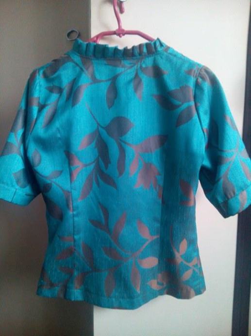 Svečani sako, veličina S/M, ruska kragna koja ide u V, ima našivene faltice na rubovima, materijal nešto kao grublja svila, boja tirkizno plava sa smeđim uzorcima, na kopčanje, kvalitetan, šivan kod krojača, novi, presijava se tkanina. Od takvog istoga materijala prodajem i haljinu koja je također u mojim oglasima za prodaju.