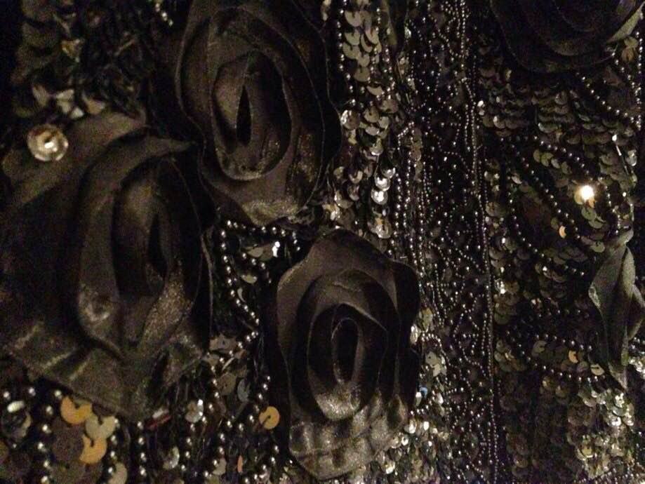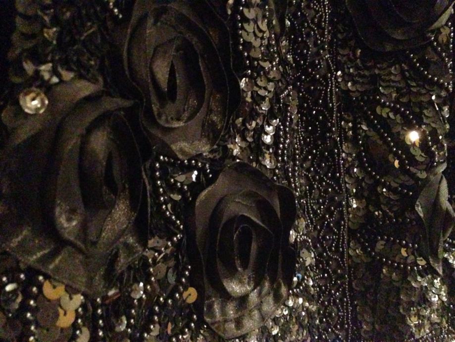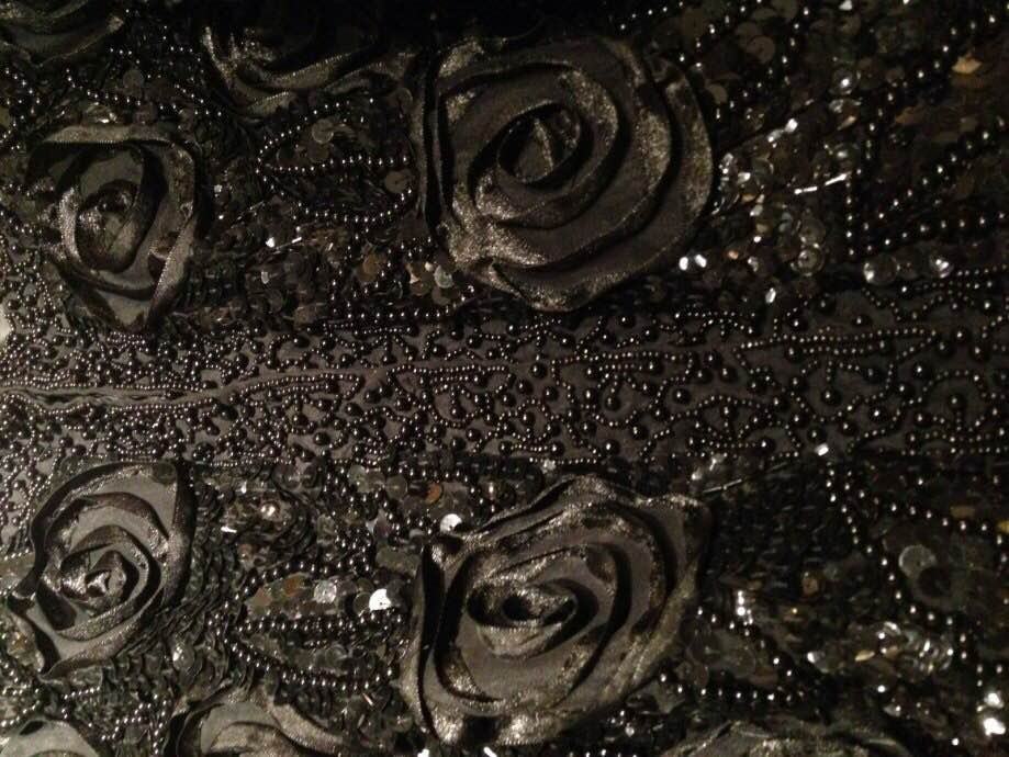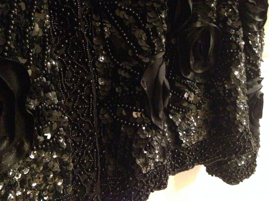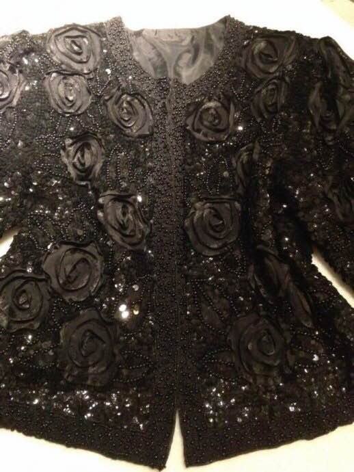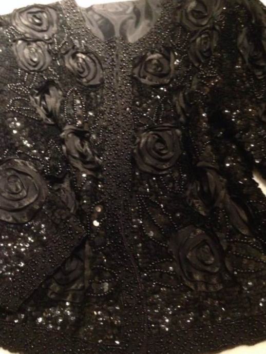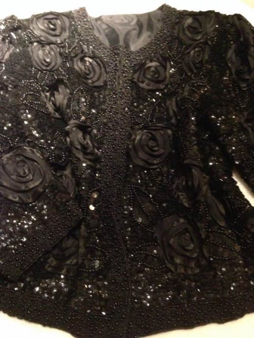Svečana crna jakna Chanel style zanimljiv večernji model, ručni rad sa crnim perlama i efektnim satenskim ružama, elegantna i efektna naročito pri večernjem svjetlu...precizno obrubljena ručnim radom sa crnim perlama,kopčanje na skrivene
