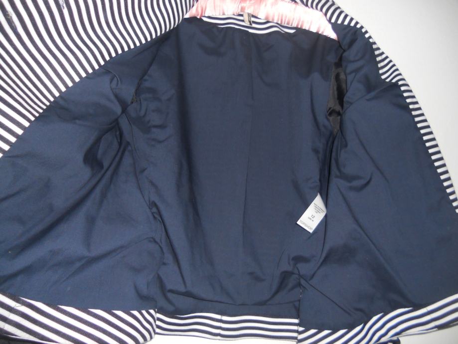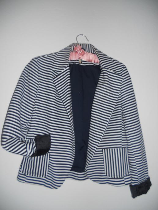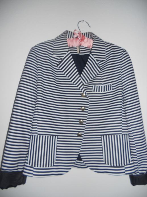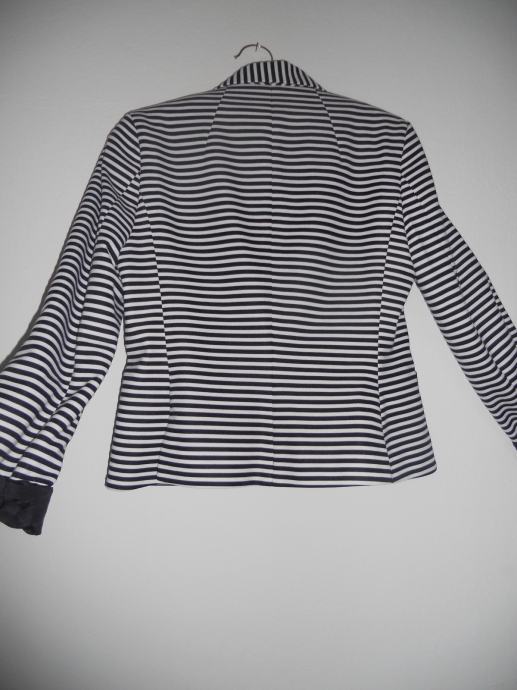 Sprijeda ima štosno kopčanje za jedan izgled a kad se nosi otkopčan opet izgleda drugačije. Može se sjajno iskombinirati sa tamno plavim dekoltiranim topom iz moje ponude. Mornarski uzorak kao vječna inspiracija dizajnerima koji ga iz godine u godinu nanovo ponavljaju u kolekcijama pa znajte da sa time ne možete pogriješiti! Sjajan i za ured za razbiti dosadu poslovnog izgleda ali i za casual varijante tipa kavica i šetnjica na trapke i štikle ili balerinke...kako god! Precijenjeno skupo plaćen pa smatram da je ova cijena korektna.