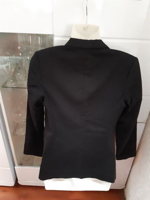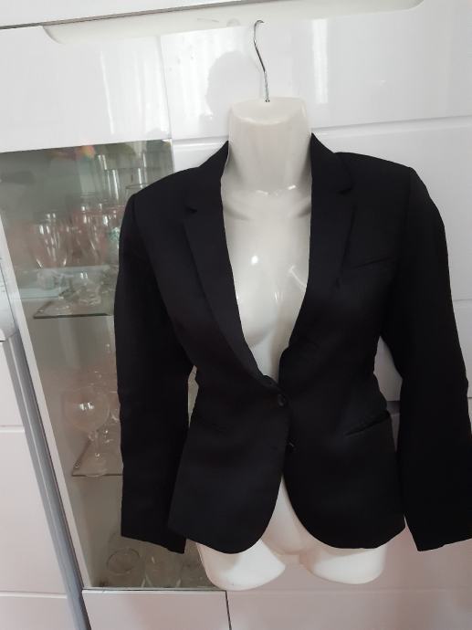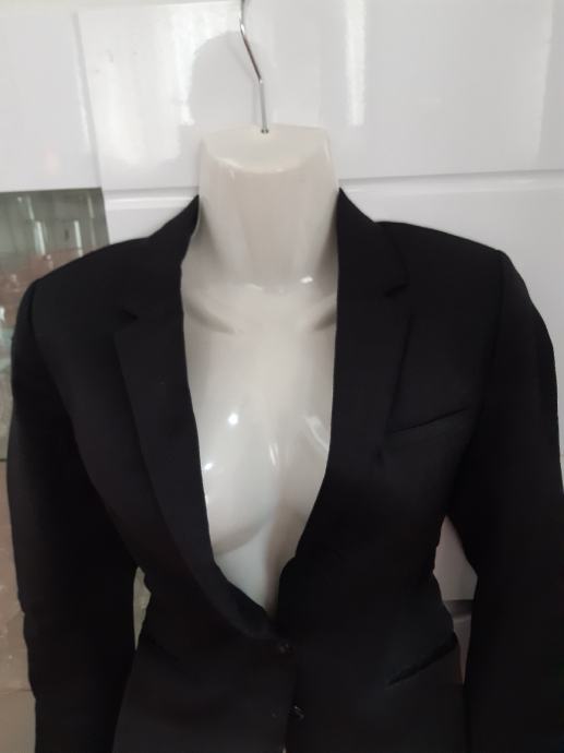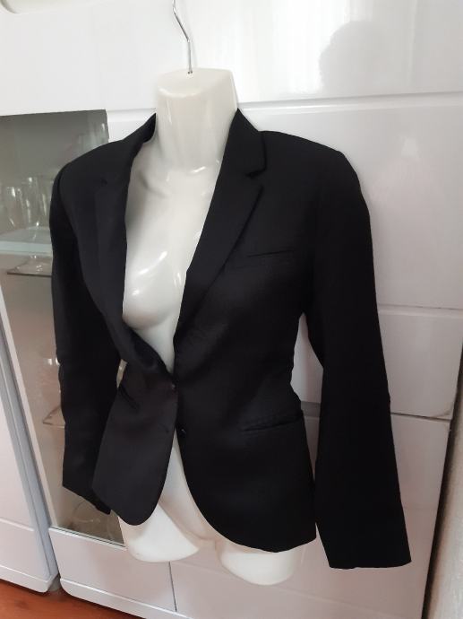 VARTEKS crni strukirani vuneni sako, vel. 34. Širina prsa, samo prednja strana: 44 cm, duzina: 60 cm, duzina rukava: 58 cm. Sastav: 60% runska vuna, 38% poliester, 2% elastin. Kao nov.