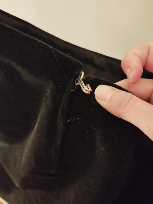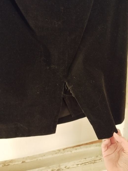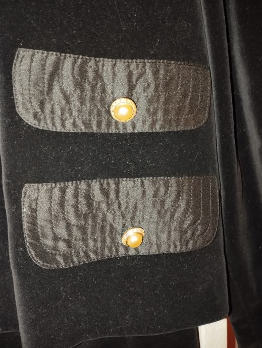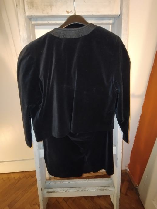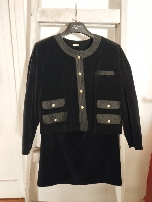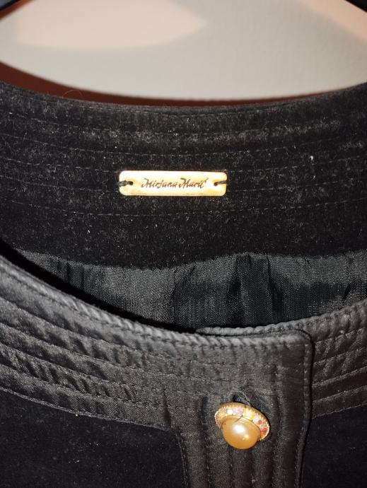 Elegantan Mirjana Marić crni kostim veličine 40. Kostim se sastoji od suknje i jakne s dekorativnim gumbima. Stilski bezvremenski, idealan za svečane prigode. Na slici prikazan popucani šav na prorezu suknje.