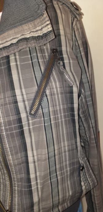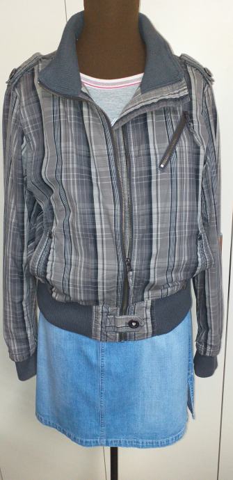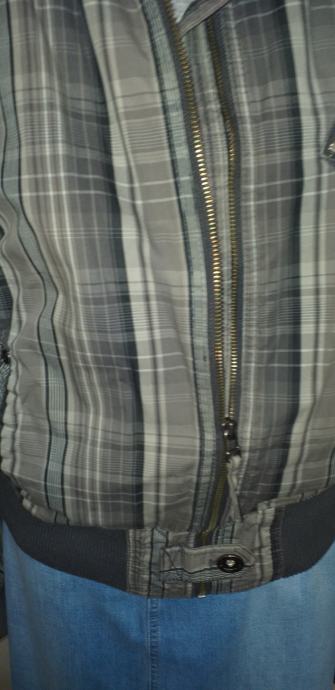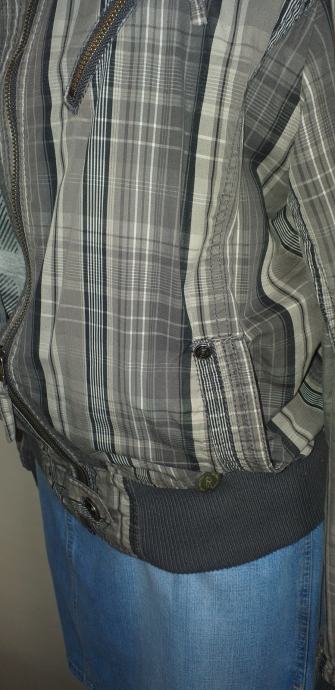 Jakna je ugodna za nosit u proljeće i jesen,karirana u sivim tonovima.Zanimljivog kroja sa detaljima na sebi,postavljena,patent kopčanje, patenti na đepovima.Dužina jakne je 60 cm, veličinaz46-48.