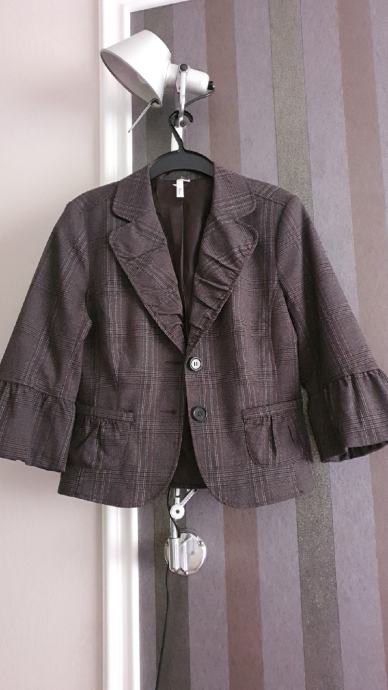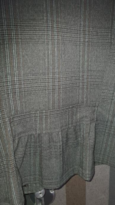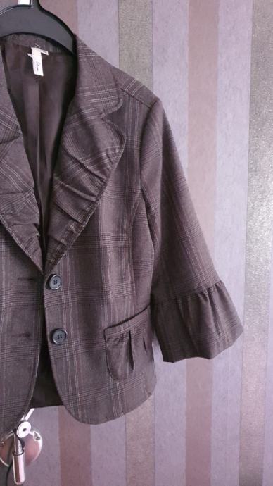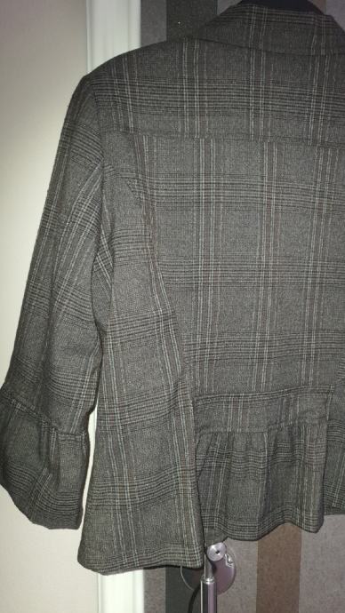 Prodajem karirani sako Etam, vel. 40, zanimljivog kroja s volančićima na rukavima , te malim volanom na stražnjem dijelu, reveri lagano faldani kao i džepići, lagano strukiran, karirani uzorak u smeđe, sivo, crnim prugicama.