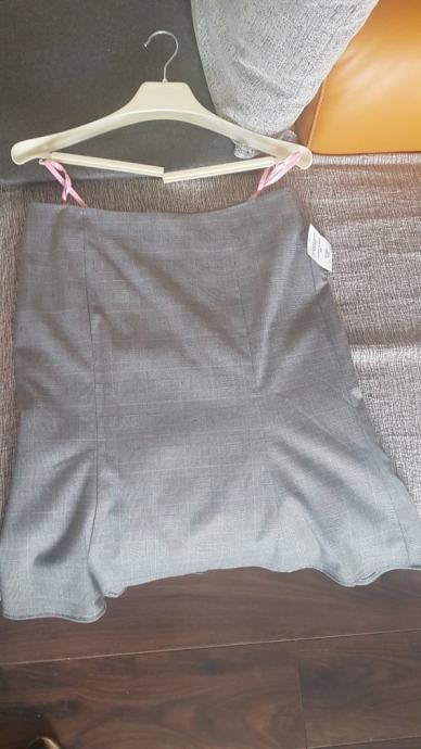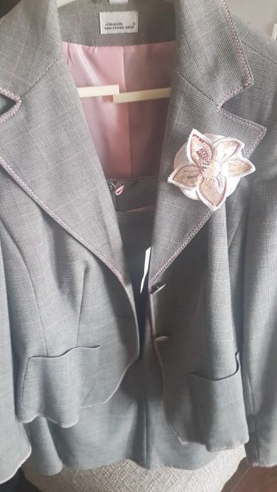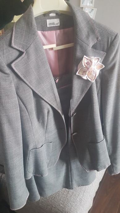 Nov, nikad nošen poslovni ženski kostim. Suknja lijepog kroja i kratki sako. Suknja broj 40, sako broj 42. Siva boja s rozim detaljima. Pamučna majica kratkih rukava i košulja dugih rukava gratis poklon.