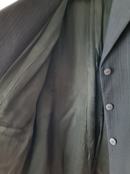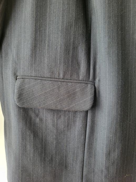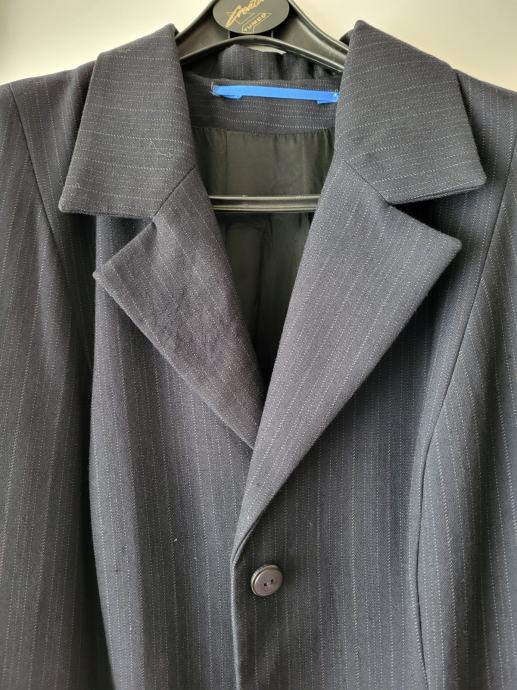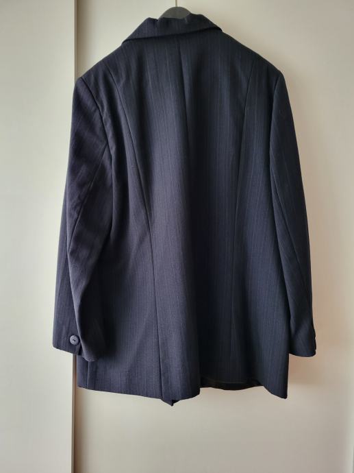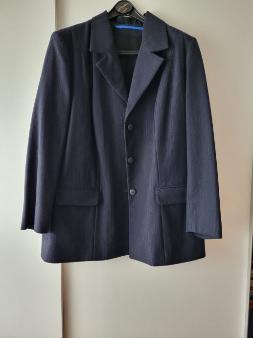 Tamnoplavi ženski sako na tanke prugice, otprilike veličina 44. Klasični kroj. Dva džepa sprijeda. Može se nositi i kao oversize.