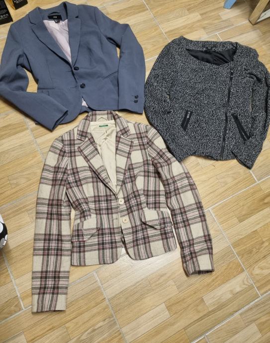 Prodajem ženske sakoe u lotu svi su vel 38 jer smo ih prerasli.Nošeni možda dva puta svaki.Karirani je Benetton ,Sivi strukirani H&M ,I siva jaknica Amisu.