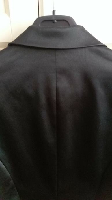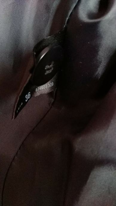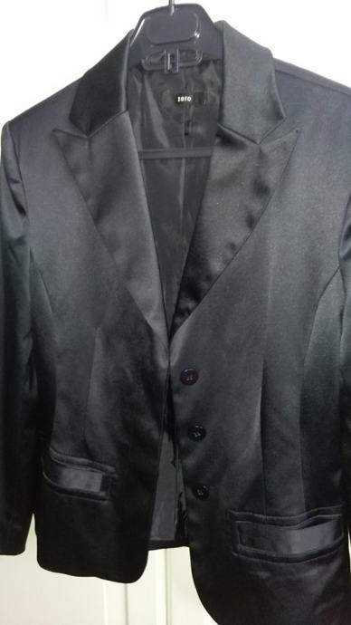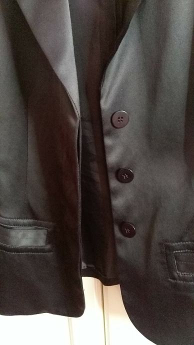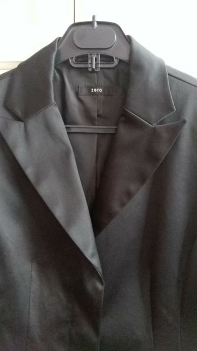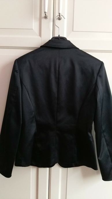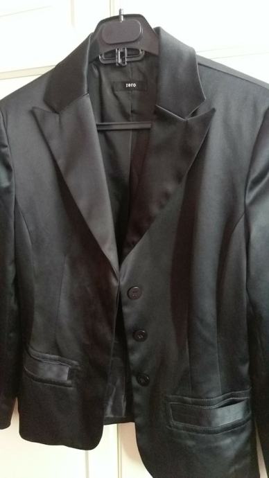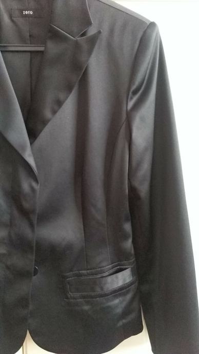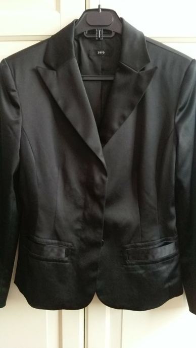 Prodajem crni sako (blejzer), saten, Zero, vel. 36, ali komotniji model, odgovara broju 38, novi. Sako je lagano strukiran, satenski, sa skrivenim kopčanjem i ukrasno štepanim džepovima.